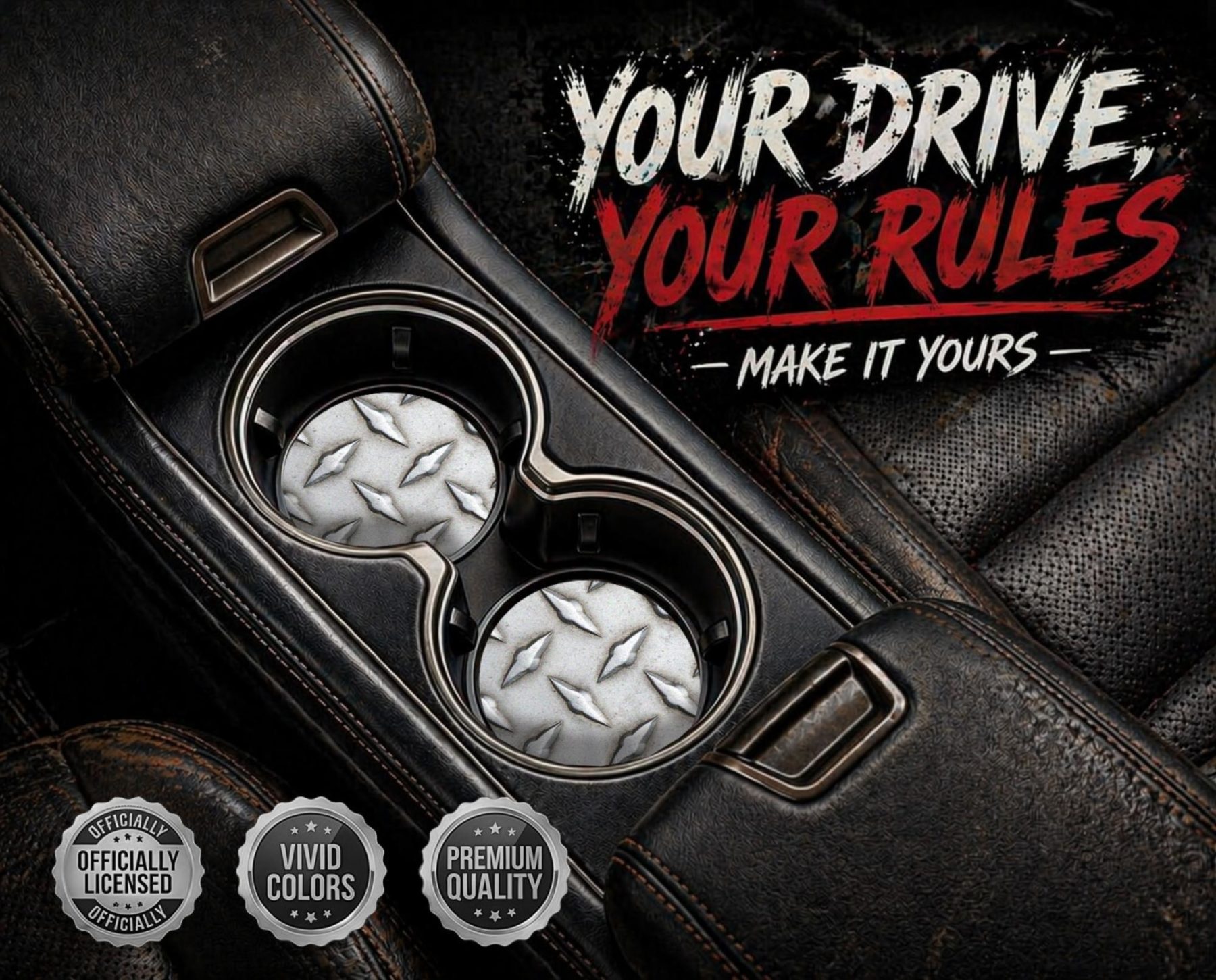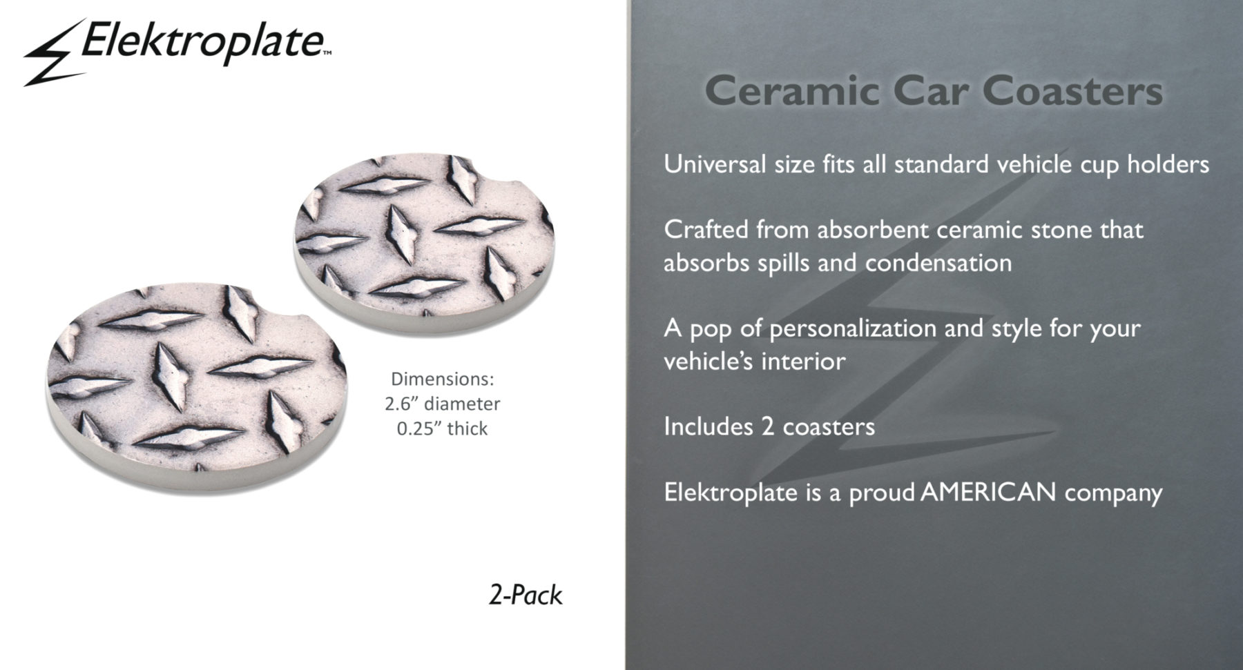 Keep your ride clean and stylish with Elektroplate's Diamond Plate Steel design Car Coasters (Set of 2). These 2.6" diameter coasters are designed to fit all standard cup holders and absorb spills and condensation while maintaining their vivid colors. Crafted with care, these high-quality car coasters not only protect your car, but also add a touch of personality to your space. Easy to clean and durable enough for everyday use, they’re the ideal accessory to showcase your style on the go.