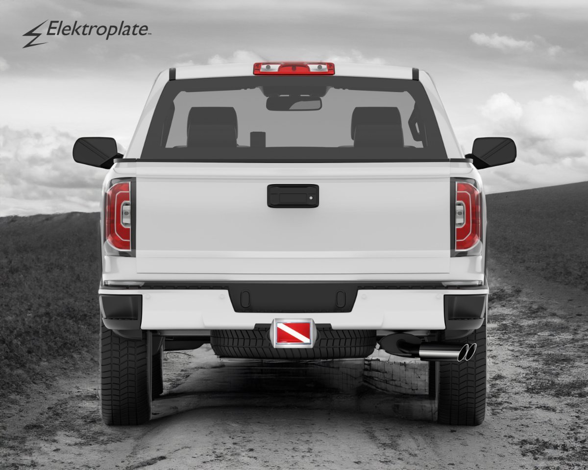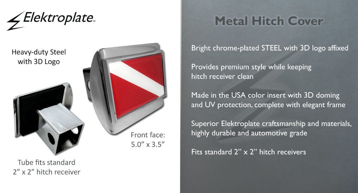Show your dive pride with the Dive Flag ALL-METAL hitch cover by Elektroplate, featuring a 5” x 3.5” front plate. This premium accessory showcases a chrome-plated Dive emblem securely mounted on a polished chrome all-metal hitch cover base. Designed to fit standard 2” trailer hitch receivers—if the fit isn’t perfect, you may return it for a full refund.
