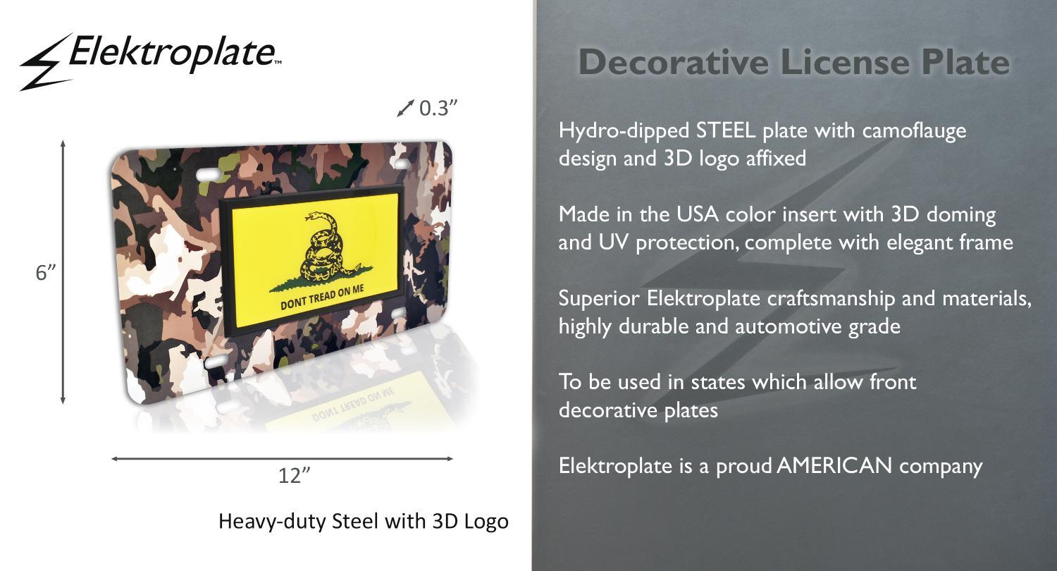 Do you love being in nature? Let our woodlands camo license plate transport you to the great outdoors every time you walk to your vehicle. This unique camo pattern is the perfect way to add personality and set your vehicle apart from the rest. Tread ALL METAL front license plate (12” x 6”) by Elektroplate. Comprised of an all metal emblem adhered to a high-grade camouflage steel license plate base via automotive-grade durable foam tape.