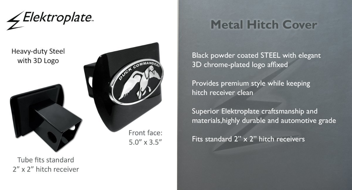 Officially licensed Duck Commander ALL-METAL hitch cover (front plate is 5” x 3.5”) by Elektroplate. Features an all-metal Buck emblem securely adhered to a black all-metal hitch cover mount. Designed to fit standard 2” trailer hitch receivers—if it doesn’t fit perfectly, you may return it for a full refund.
