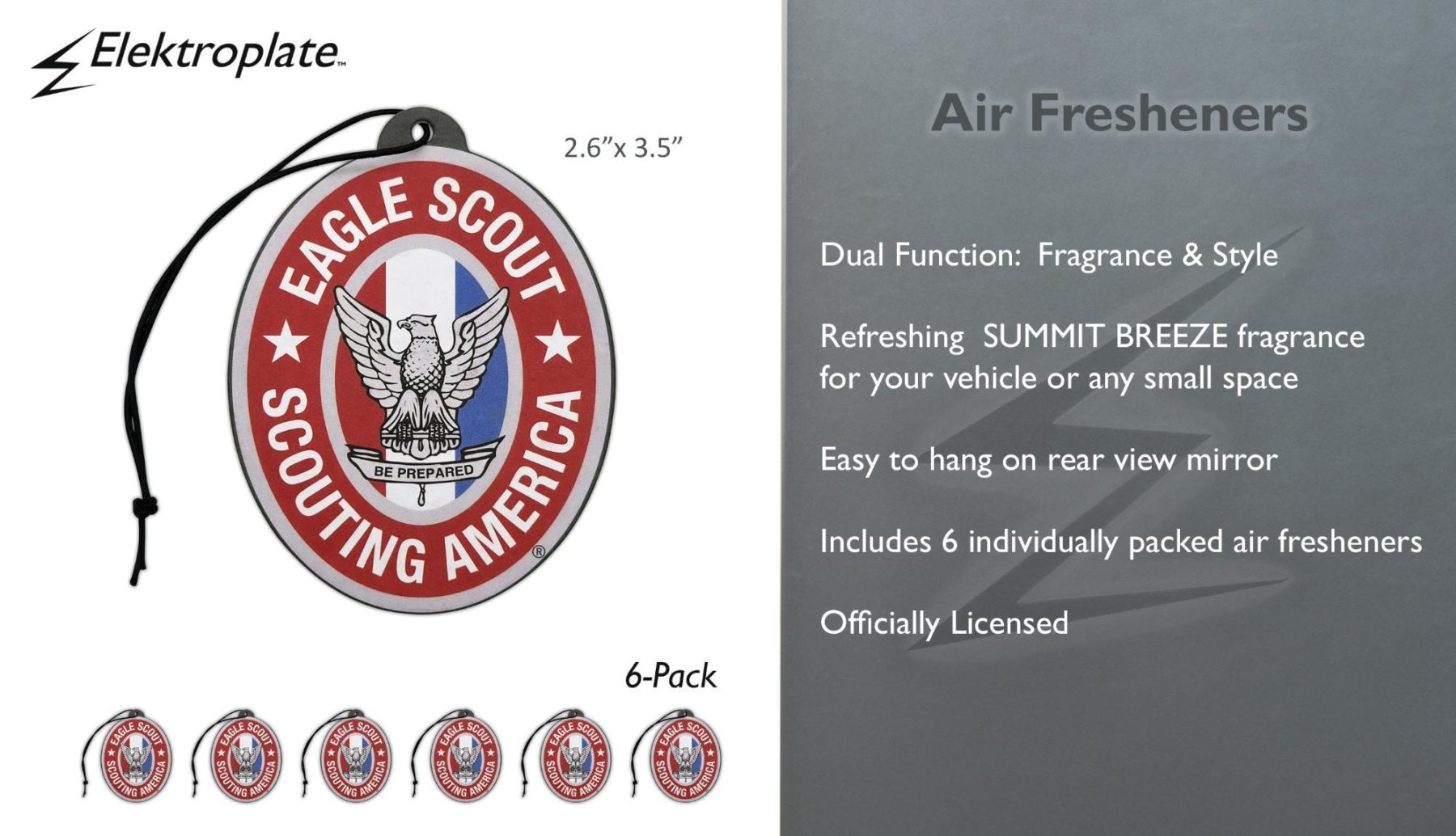 Bring a clean, elevated scent to every drive with the Elektroplate Eagle Scout air freshener in Summit Breeze. Designed for both fragrance and style, this officially licensed Scouting America air freshener features a bold, iconic design paired with a refreshing scent profile of musk, sandalwood, and amber. Perfect for your car, truck, or SUV, it easily hangs from your rearview mirror to deliver long-lasting freshness while showcasing a meaningful symbol of achievement and pride. The compact 2.6" x 3.5" size makes it ideal for vehicles or small spaces like lockers, offices, or closets.