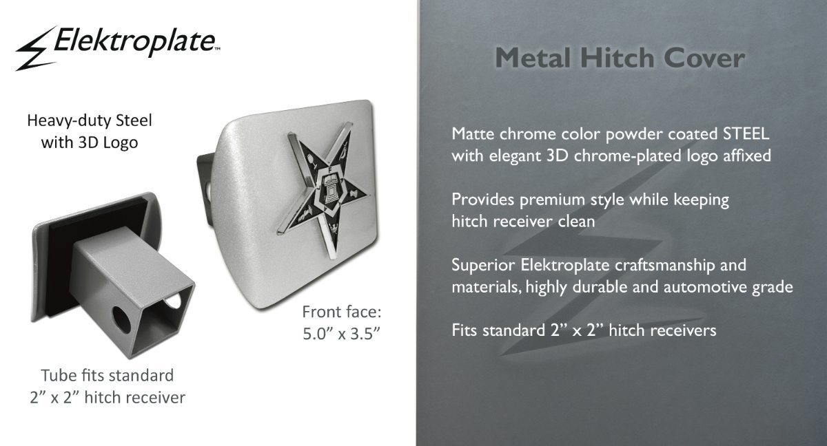 Proudly display your Masonic affiliation with this Eastern Star all-metal hitch cover by Elektroplate. Featuring a chrome-plated Eastern Star emblem mounted on a brushed black all-metal hitch plate measuring 5” x 3.5”, this accessory offers a striking blend of elegance and strength. Designed to fit standard 2” trailer hitch receivers, and if it doesn’t fit perfectly, you may return it for a full refund.