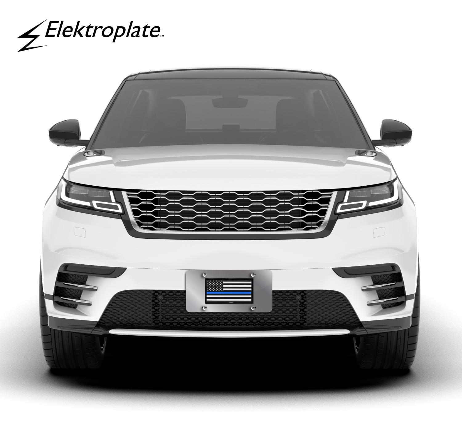 Show your support for law enforcement with the all-metal Thin Blue Line American Flag front license plate by Elektroplate (12” x 6”). Featuring a sleek stainless steel metal base with an OEM-quality frame and an oversized UV-protected decal with 3D doming, this plate delivers a bold, high-quality look. The striking black-and-white American flag with a thin blue line stands as a symbol of honor, courage, and respect for police officers.