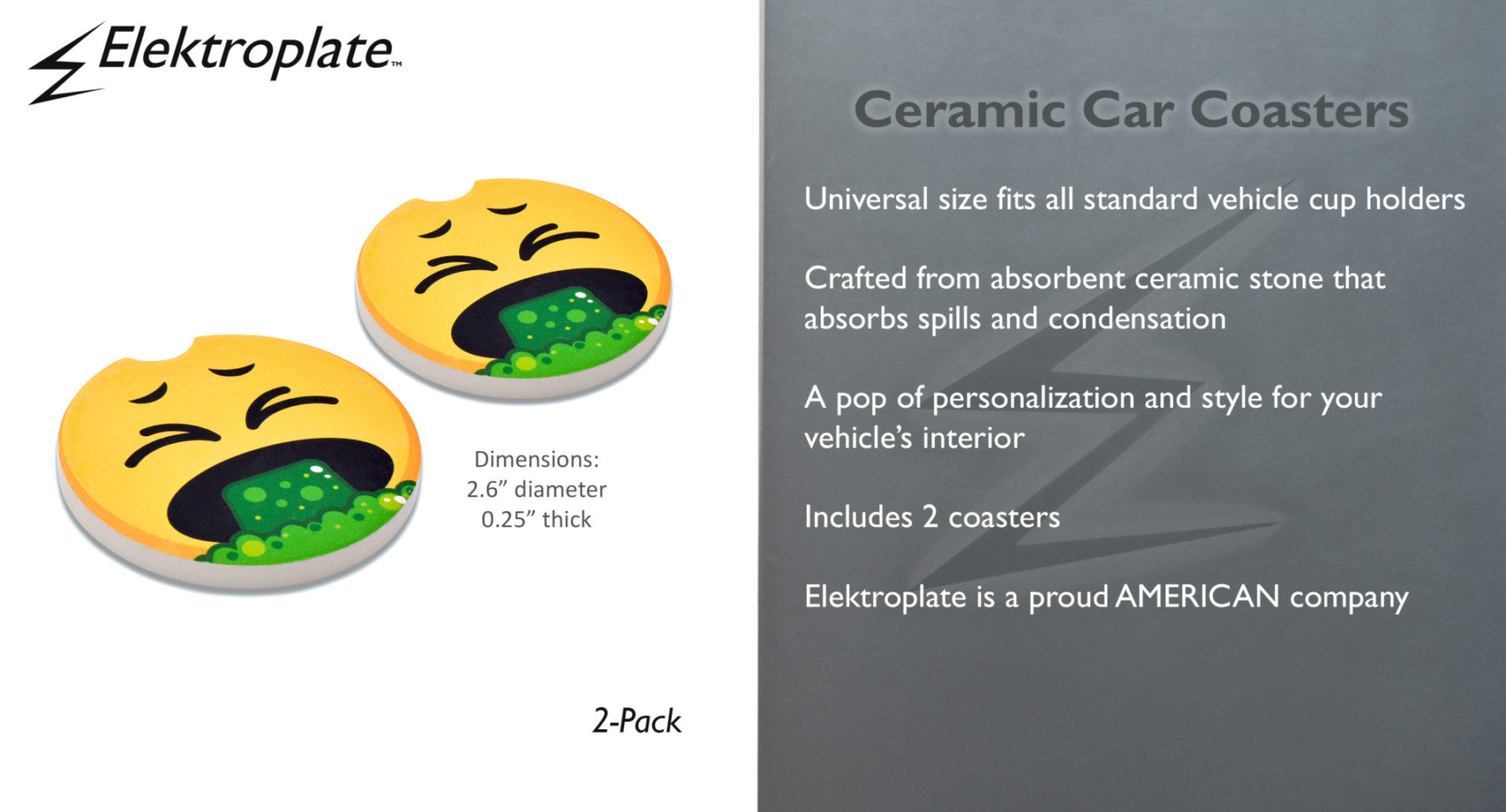 Keep your ride clean and stylish with Elektroplate's Puke Face Car Coasters (Set of 2). These 2.6" diameter coasters are designed to fit all standard cup holders and absorb spills and condensation while maintaining their vivid colors. Crafted with care, these high-quality car coasters not only protect your car, but also add a touch of personality to your space. Easy to clean and durable enough for everyday use, they’re the ideal accessory to showcase your style on the go.