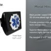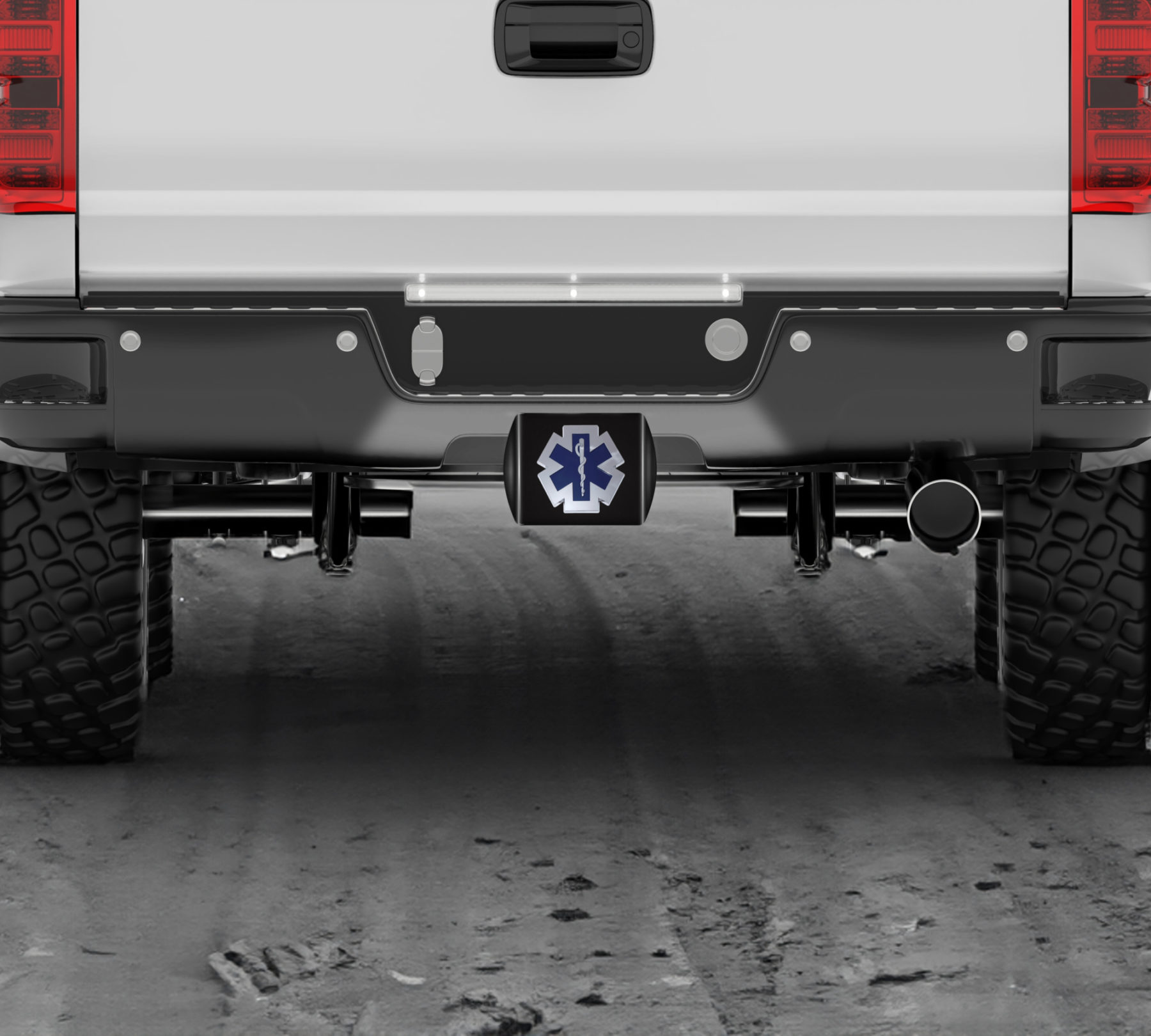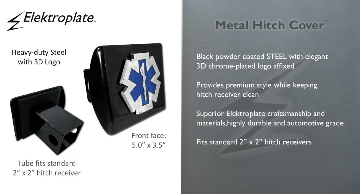 EMS ALL-METAL hitch cover (front plate is 5” x 3.5”) by Elektroplate — a step above in quality and appearance compared to cheaper plastic and pewter versions. Features an EMS emblem with an OEM ABS plastic core and chrome-plated metal finish, securely mounted on a black all-metal hitch cover. Fits standard 2” trailer hitch receivers (if it doesn’t fit perfectly, you may return it for a full refund).