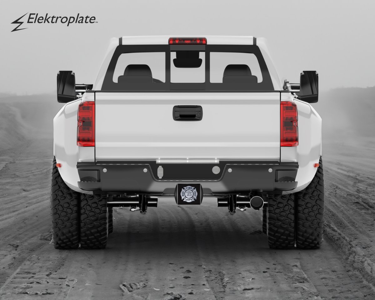 Firefighter ALL-METAL hitch cover (front plate is 5” x 3.5”) by Elektroplate — a step above in quality and appearance compared to cheaper plastic and pewter versions. Features a Fire emblem with an OEM ABS plastic core and chrome-plated metal finish, securely mounted on a black all-metal hitch cover. Fits standard 2” trailer hitch receivers (if it doesn’t fit perfectly, you may return it for a full refund).