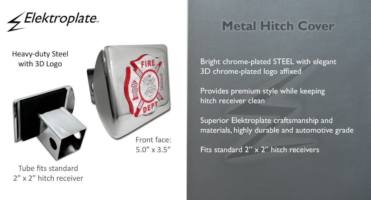 Firefighter ALL-METAL hitch cover (front plate is 5” x 3.5”) by Elektroplate — a step above in quality and appearance compared to cheaper plastic and pewter versions. Features a Fire emblem with an OEM ABS plastic core and chrome-plated metal finish, securely mounted on a chrome all-metal hitch cover. Fits standard 2” trailer hitch receivers (if it doesn’t fit perfectly, you may return it for a full refund).