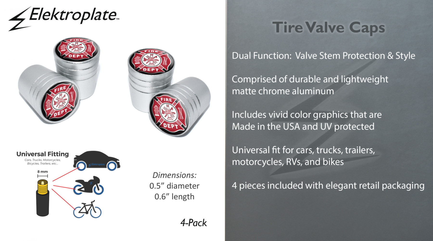 Firefighter 4-Piece Matte Chrome Universal Valve Stem Caps by Elektroplate. Built with UV-protected, scratch-resistant domed graphics made in the USA, these premium valve caps combine rugged durability with a sleek matte chrome finish. Each cap is constructed from lightweight, corrosion-resistant aluminum and includes a high-quality leakproof sealing ring to help prevent pressure loss.