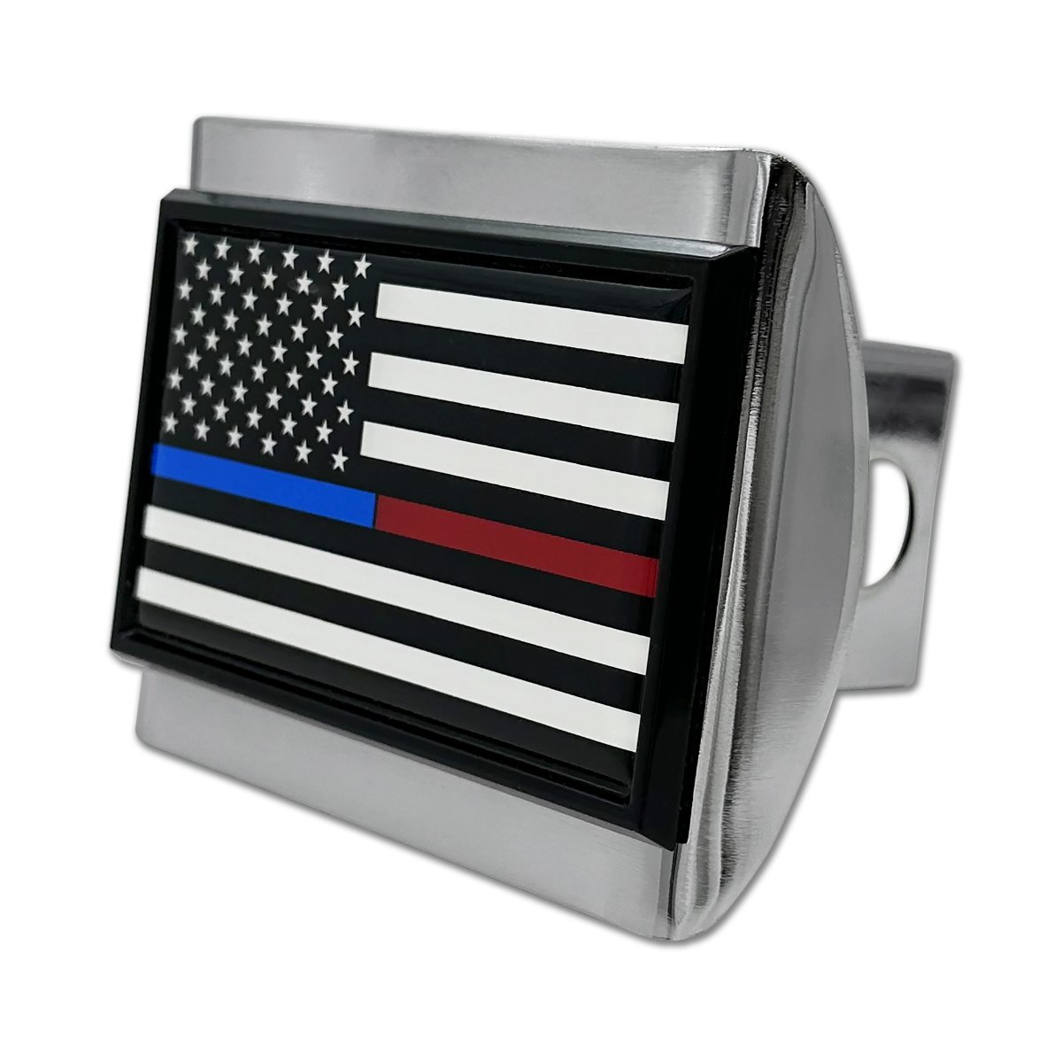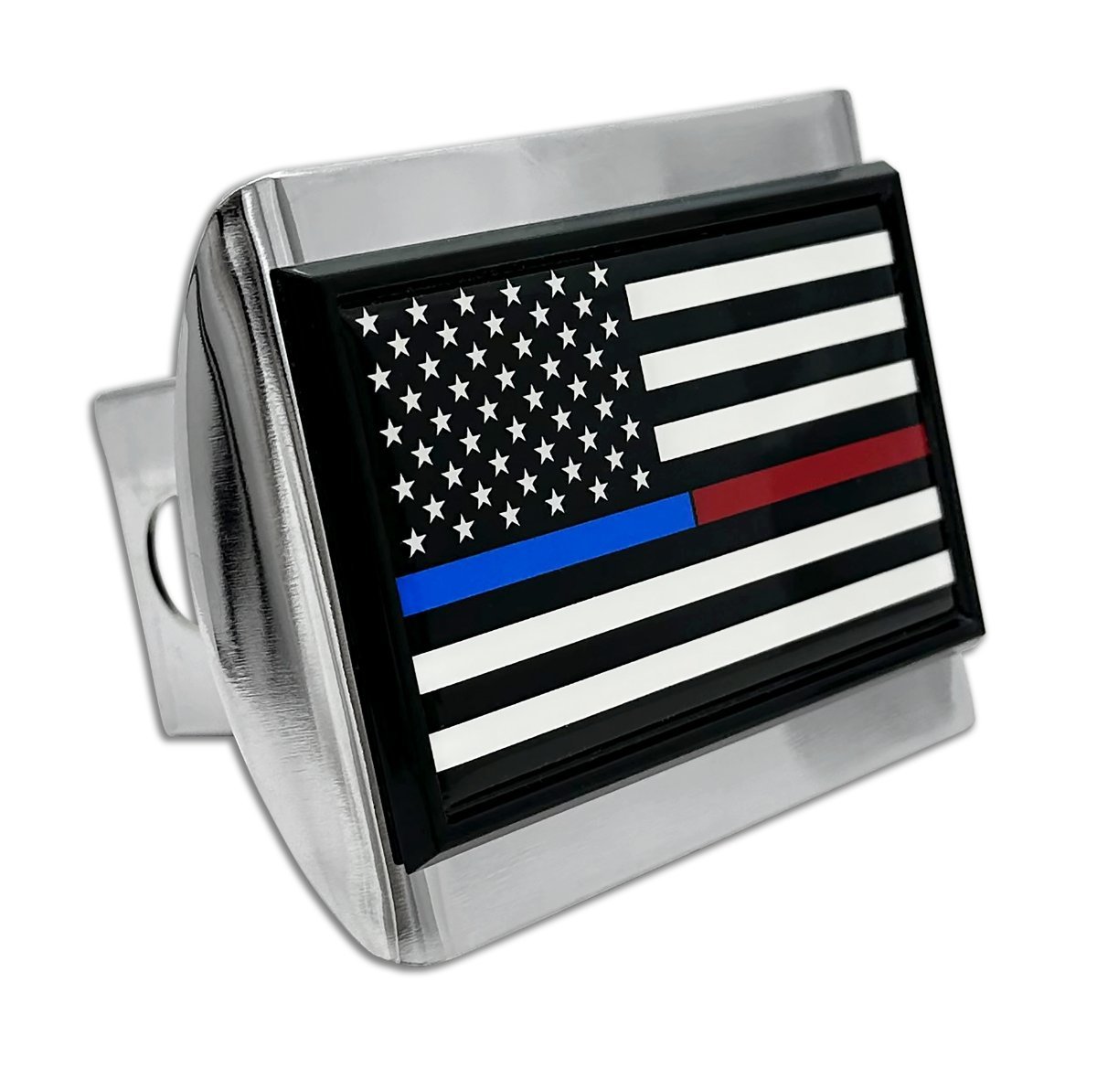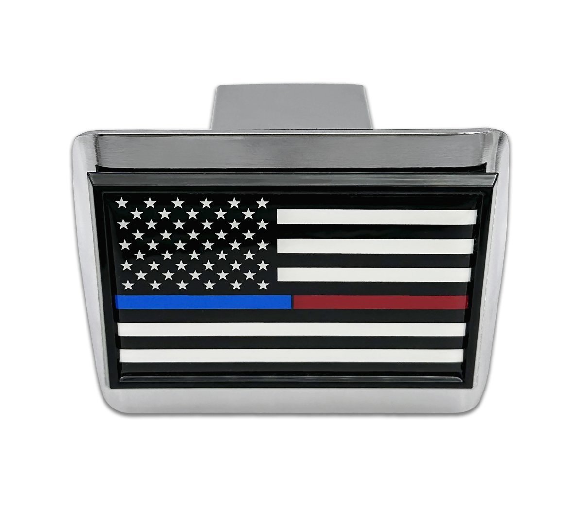 First Responders USA Flag ALL-METAL hitch cover (front plate is 5” x 3.5”) by Elektroplate. A step above in quality and appearance over cheaper plastic and pewter versions. Comprised of OEM (ABS plastic core with a chrome-plated metal finish) Police and Fire emblem adhered to a chrome all-metal hitch cover mount. The hitch cover fits standard 2” trailer hitch receivers (if it does not fit perfectly, you may return for a full refund).