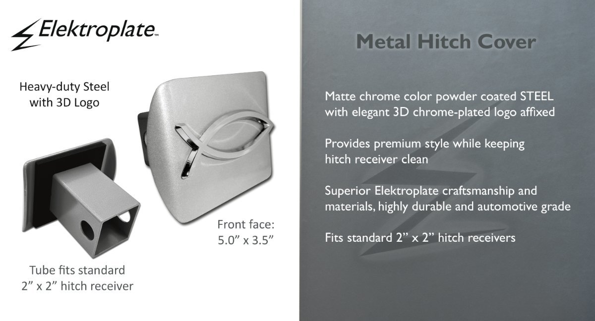 Christian Fish ALL-METAL hitch cover (front plate is 5” x 3.5”) by Elektroplate. A step above in quality and appearance over cheaper plastic and pewter versions. Comprised of an all-metal Fish emblem adhered to a brushed all-metal hitch cover mount. Hitch cover fits standard 2” trailer hitch receivers (if it does not fit perfectly, you may return for a full refund).