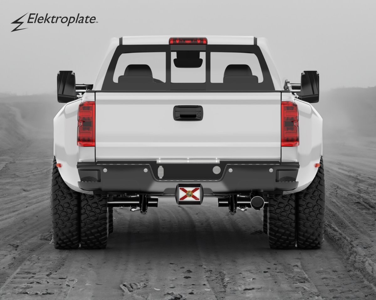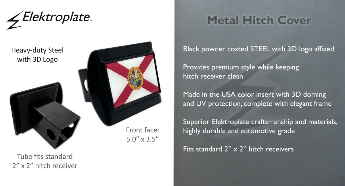 Florida State Flag ALL-METAL hitch cover (front plate measures 5” x 3.5”) by Elektroplate offers superior quality and appearance compared to cheaper plastic and pewter versions. It features an OEM ABS plastic core with a chrome-plated metal finish Florida emblem securely adhered to a black all-metal hitch cover mount. Designed to fit standard 2” trailer hitch receivers—if it doesn’t fit perfectly, you may return it for a full refund.
