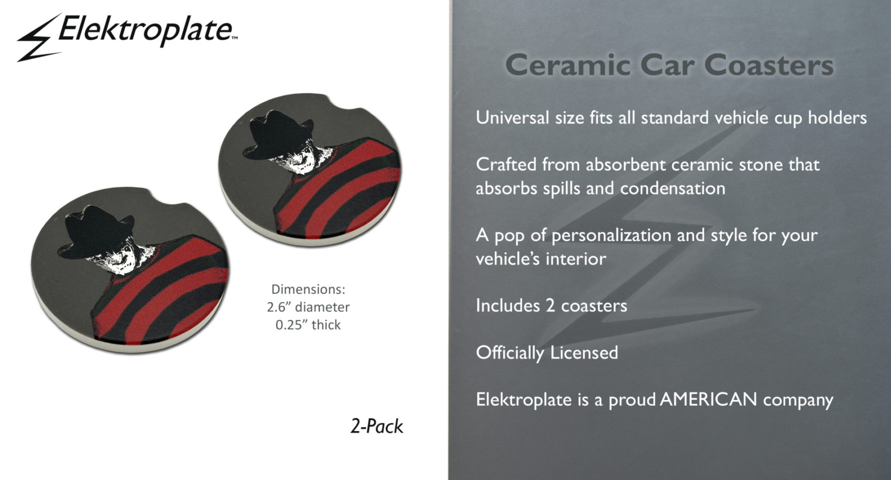 Keep your ride clean and stylish with Elektroplate's Officially Licensed Freddy Krueger Nightmare on Elm Street Car Coasters (Set of 2). These 2.6" diameter coasters are designed to fit all standard cup holders and absorb spills and condensation while maintaining their vivid colors. Crafted with care, these high-quality car coasters not only protect your car, but also add a touch of personality to your space. Easy to clean and durable enough for everyday use, they’re the ideal accessory to showcase your style on the go.