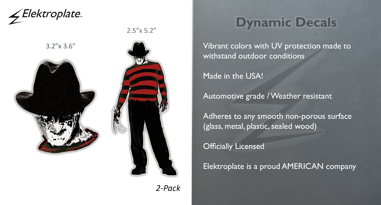 Elektroplate Officially Licensed Freddy Krueger Nightmare on Elm Street Decal 2-Pack. UV-Protected full-color graphic sticker for application on any smooth, flat surface.