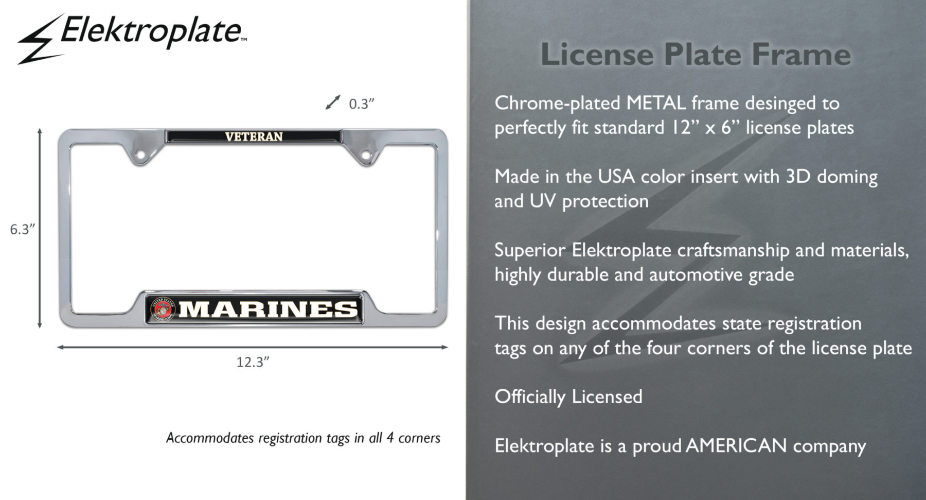 Show your Marine Corps pride with this officially licensed U.S. Marines chrome metal license plate frame (12.3" x 6.3") by Elektroplate. Made from premium, rust-resistant metal, this frame features a sleek black finish and full-color, UV-protected domed inserts designed to withstand the elements without fading, chipping, or tarnishing. Engineered for lasting durability and bold visual appeal, this frame is a standout way to honor your service or support the Corps wherever you drive. It maintains a like-new appearance for years—unlike lower-quality alternatives that quickly deteriorate. Each Elektroplate frame arrives in elegant retail packaging, making it a perfect gift for Marines, veterans, or patriotic supporters. |