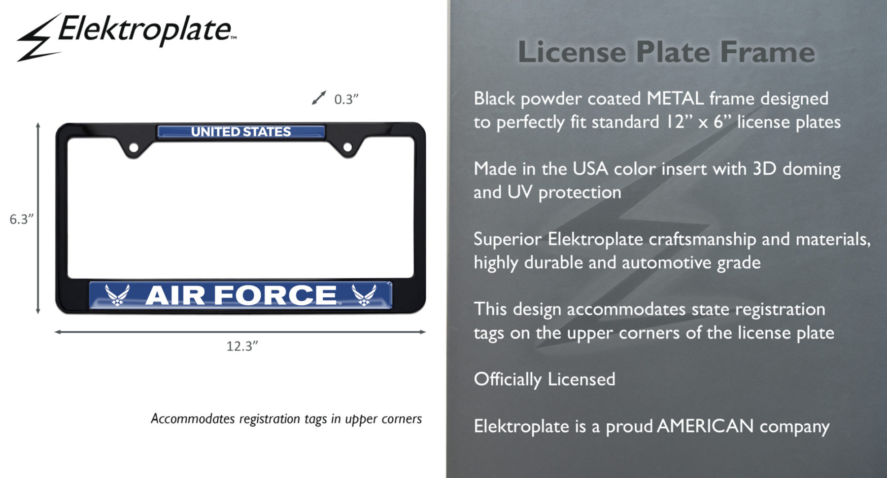 Officially licensed – U.S. Air Force black metal license plate frame (12.3" x 6.3") by Elektroplate. All-metal (NOT plastic) frame with a black finish, and full color UV-protected domed inserts. All Elektroplate license plate frames are comprised of a metal finish made to withstand harsh outdoor conditions. This metal frame will look brand new for years to come (as opposed to cheap imitations that will fade or chip within months of being on your vehicle). Our high-end license plate frames are the perfect way to showcase your military pride everywhere you drive. In addition, all Elektroplate products are packaged in elegant retail packaging to make a great gift!