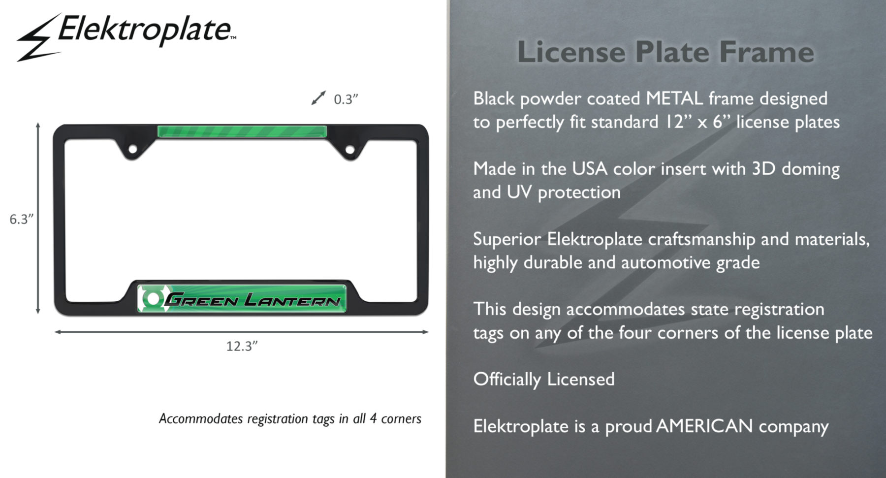 Elevate your vehicle’s style with this Officially Licensed DC Comics Green Lantern black powder coated metal license plate frame (12.3" x 6.3") by Elektroplate. This high-quality all-metal frame is built to endure the elements, ensuring it remains looking brand new for years without chipping or fading. The frame features Made in the USA graphic inserts with 3D doming, vivid colors, and UV protection.
