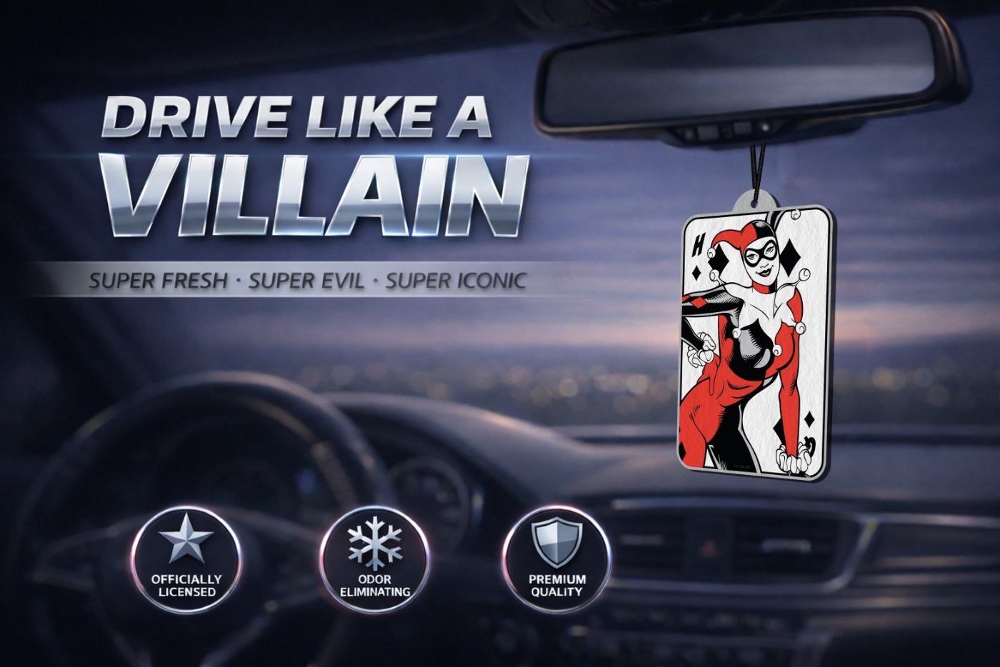 Easy to hang and perfectly sized, these air fresheners are ideal for your car, truck, SUV, RV, home, or any small space. Plus, every Elektroplate air freshener comes in stylish, gift-ready retail packaging making it a perfect pick for Harley Quinn fans, DC collectors, and anyone who loves a little wild energy on the go.