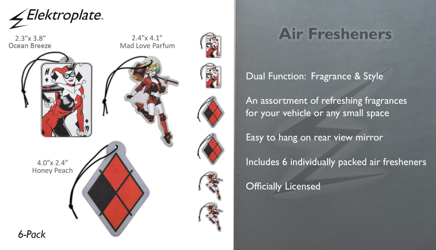 Elektroplate brings mischievous charm and bold style to your ride with a playful line of high-quality decorative air fresheners inspired by Harley Quinn! Add a little chaos and fun to your space as Gotham’s favorite troublemaker keeps things smelling fresh while turning heads. Each 6-pack includes 3 Officially Licensed, vibrant Harley Quinn reversible designs and scents (approx. 4" tall) featuring the iconic anti-heroine and her logo.