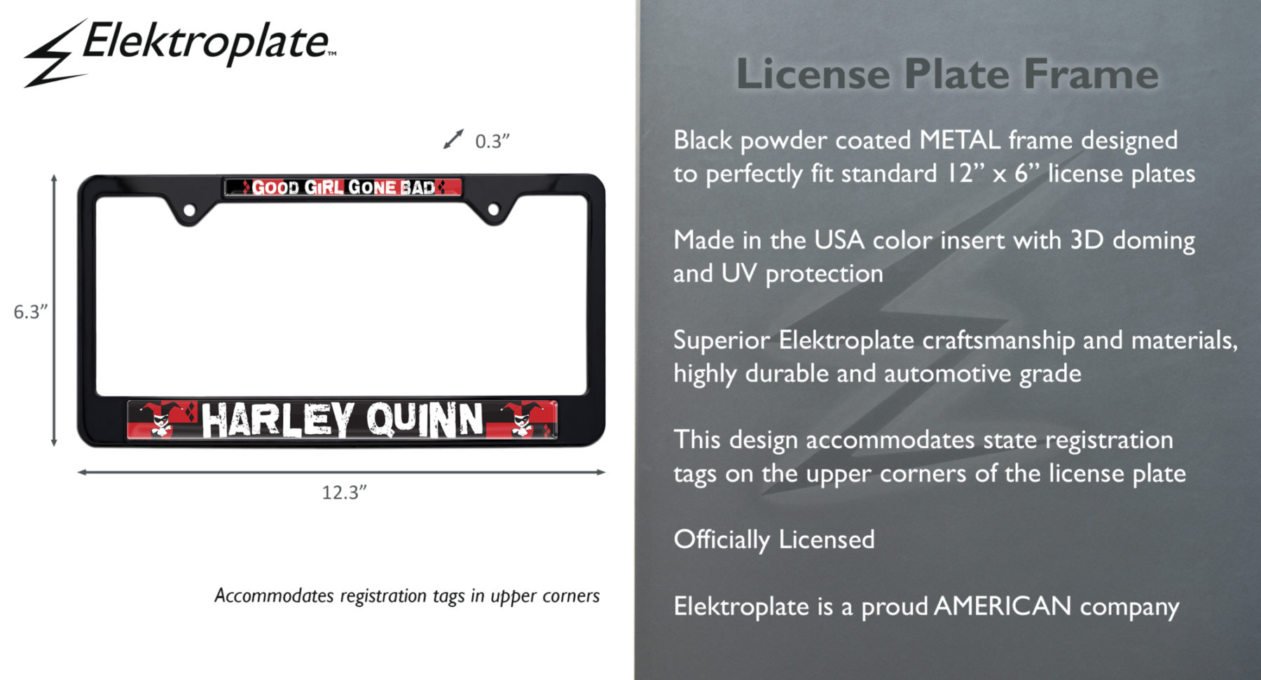 Elevate your vehicle’s style with this Officially Licensed DC Comics Harley Quinn black powder coated metal license plate frame (12.3" x 6.3") by Elektroplate. This high-quality all-metal frame is built to endure the elements, ensuring it remains looking brand new for years without chipping or fading. The frame features Made in the USA graphic inserts with 3D doming, vivid colors, and UV protection.