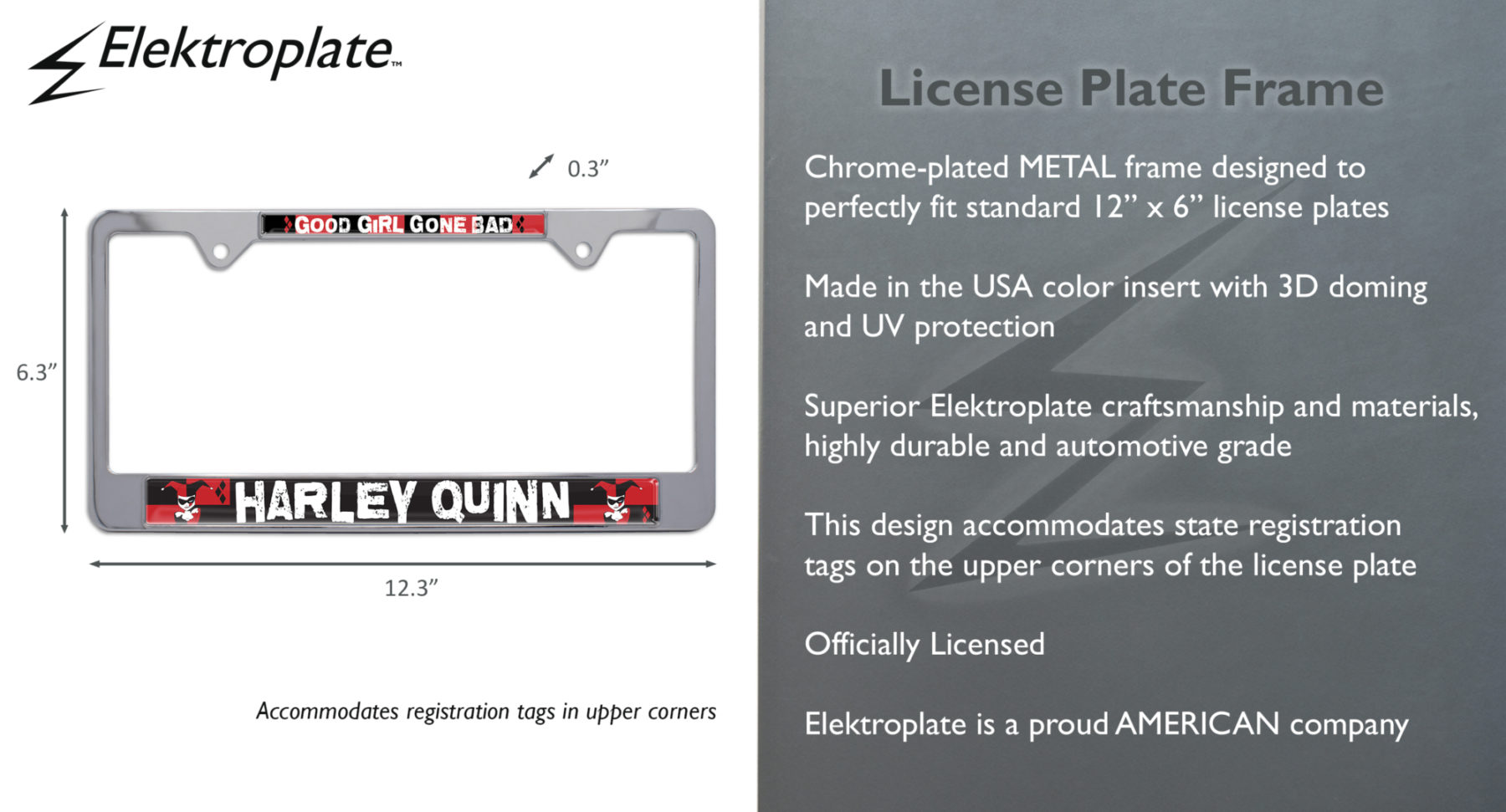 Elevate your vehicle’s style with this Officially Licensed DC Comics Harley Quinn chrome-plated metal license plate frame (12.3" x 6.3") by Elektroplate. This high-quality all-metal frame is built to endure the elements, ensuring it remains looking brand new for years without chipping or fading. The frame features Made in the USA graphic inserts with 3D doming, vivid colors, and UV protection.