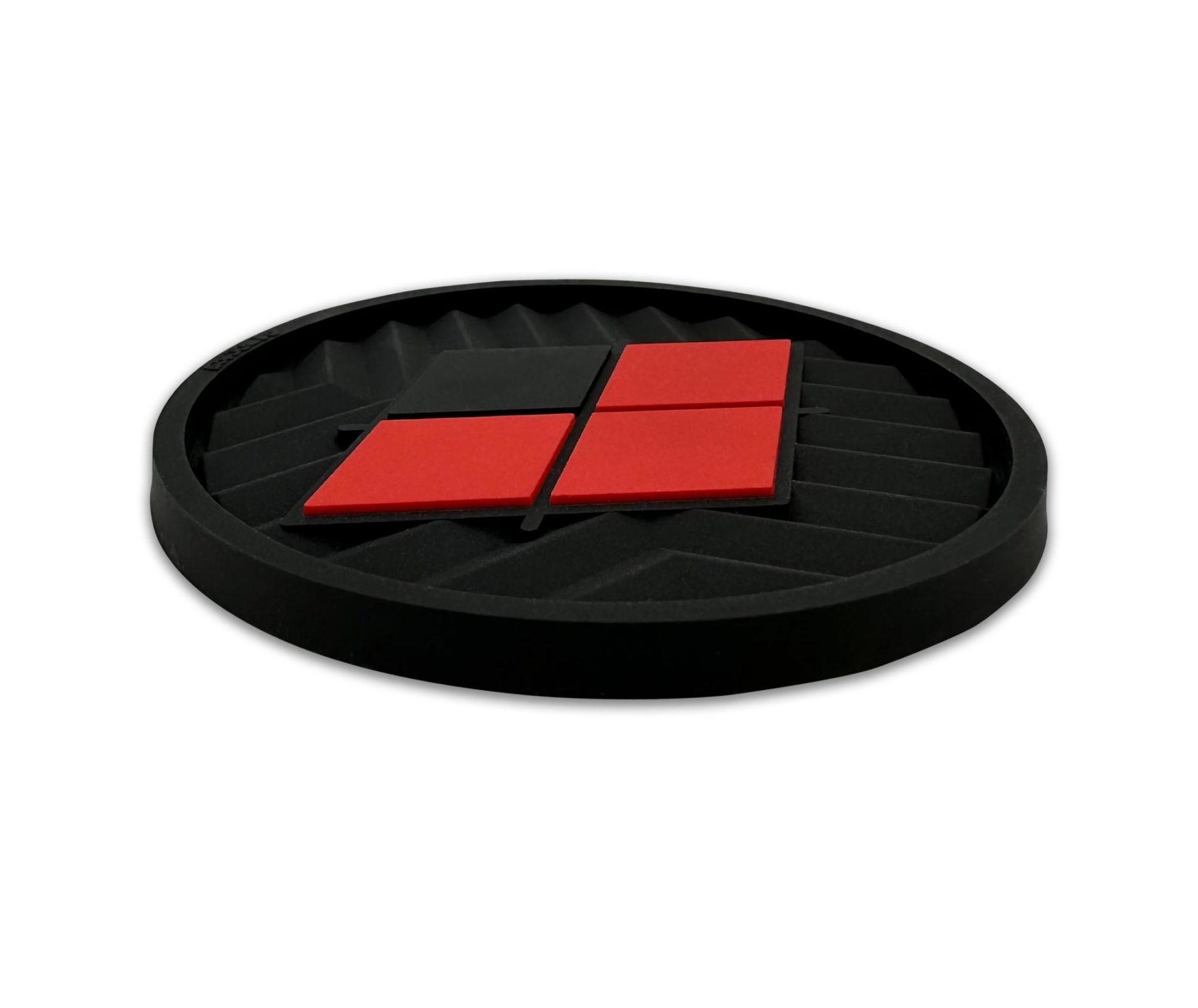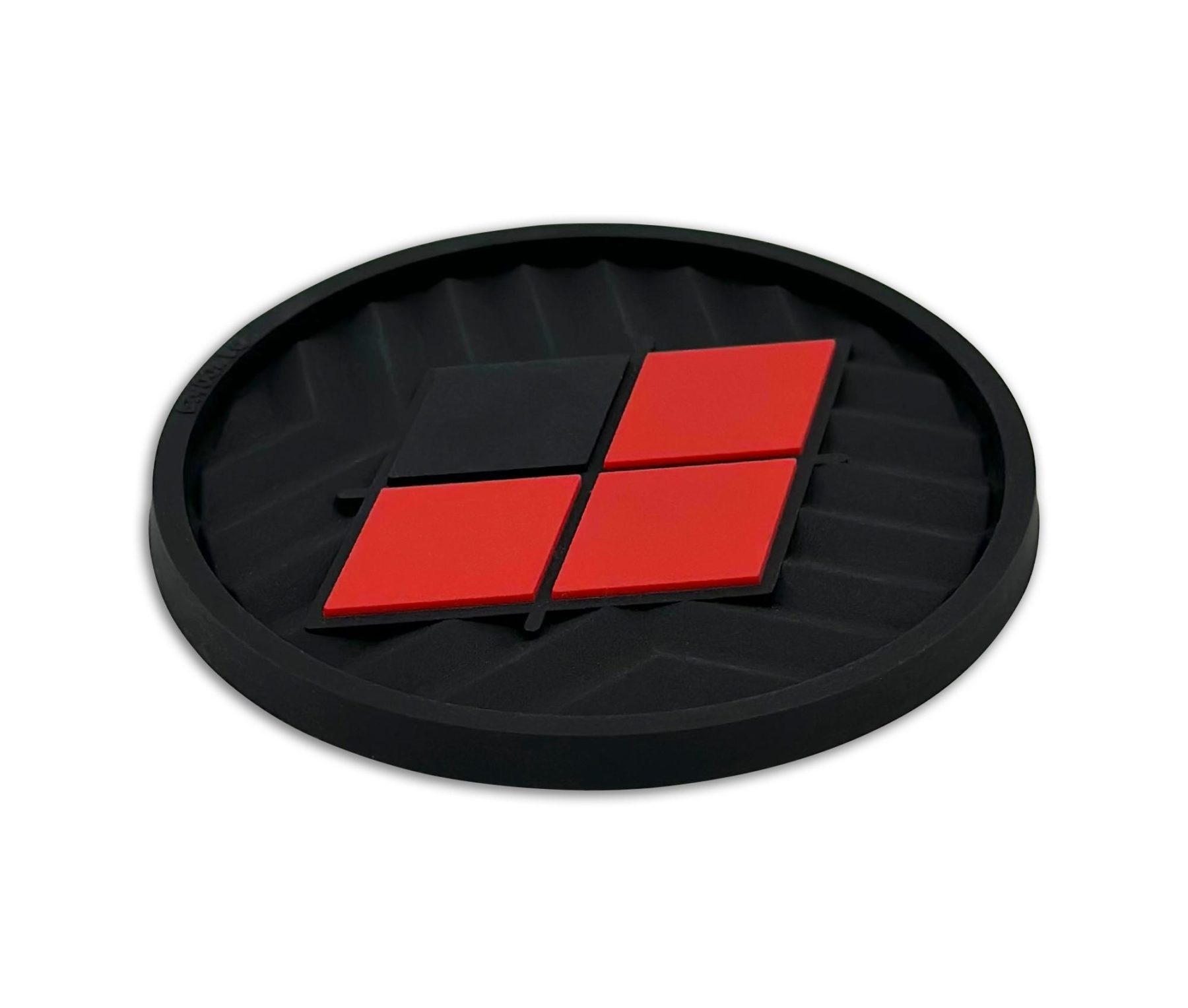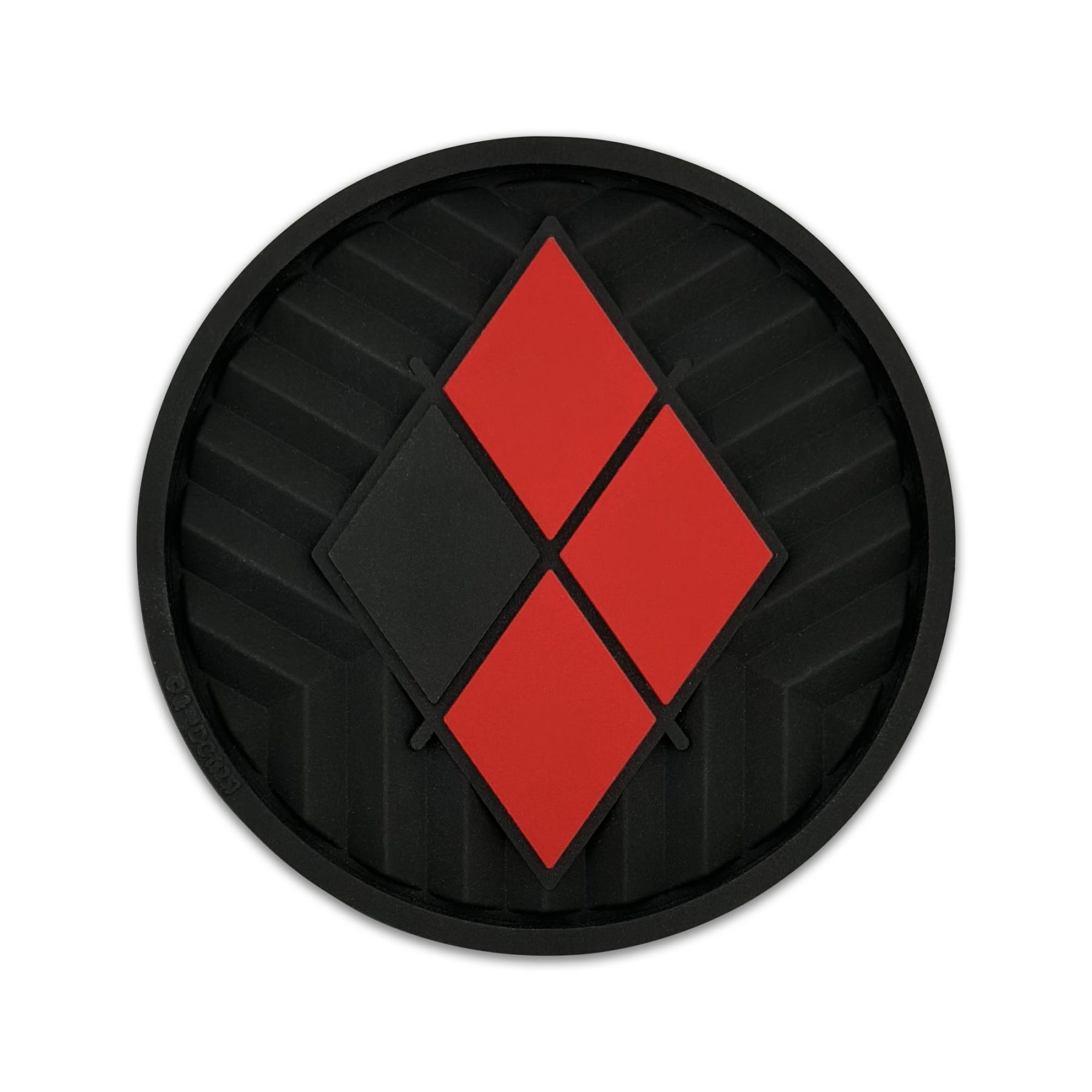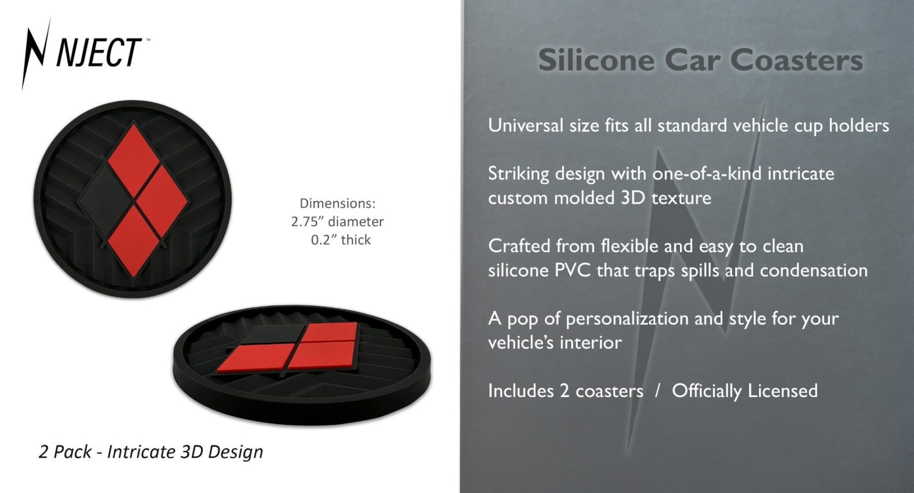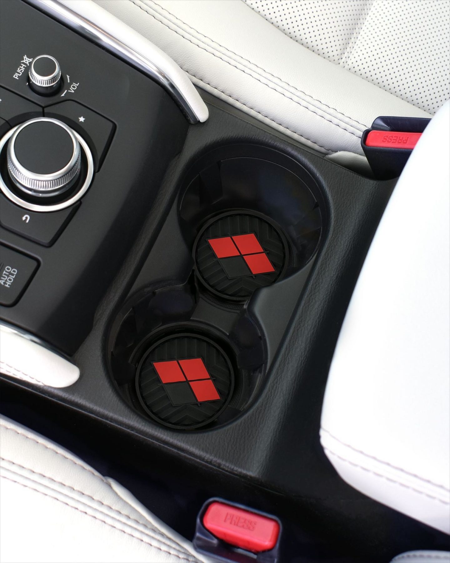 This 2-pack of silicone car coasters features a striking Harley Quinn-inspired diamond design with intricate custom molded 3D texture and bold color contrast. The raised detailing adds depth, durability, and visual impact while providing a pop of personality and style to your vehicle’s interior. Designed for everyday use, these silicone cup holder coasters combine functional protection with iconic DC Comics flair in a durable automotive accessory.