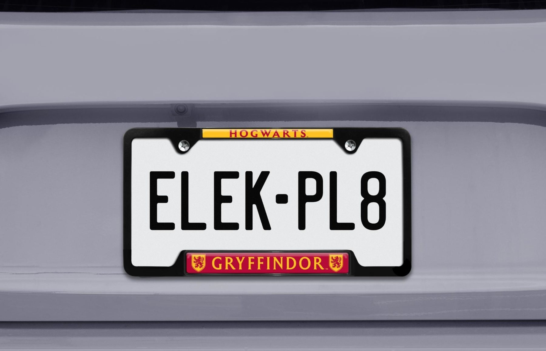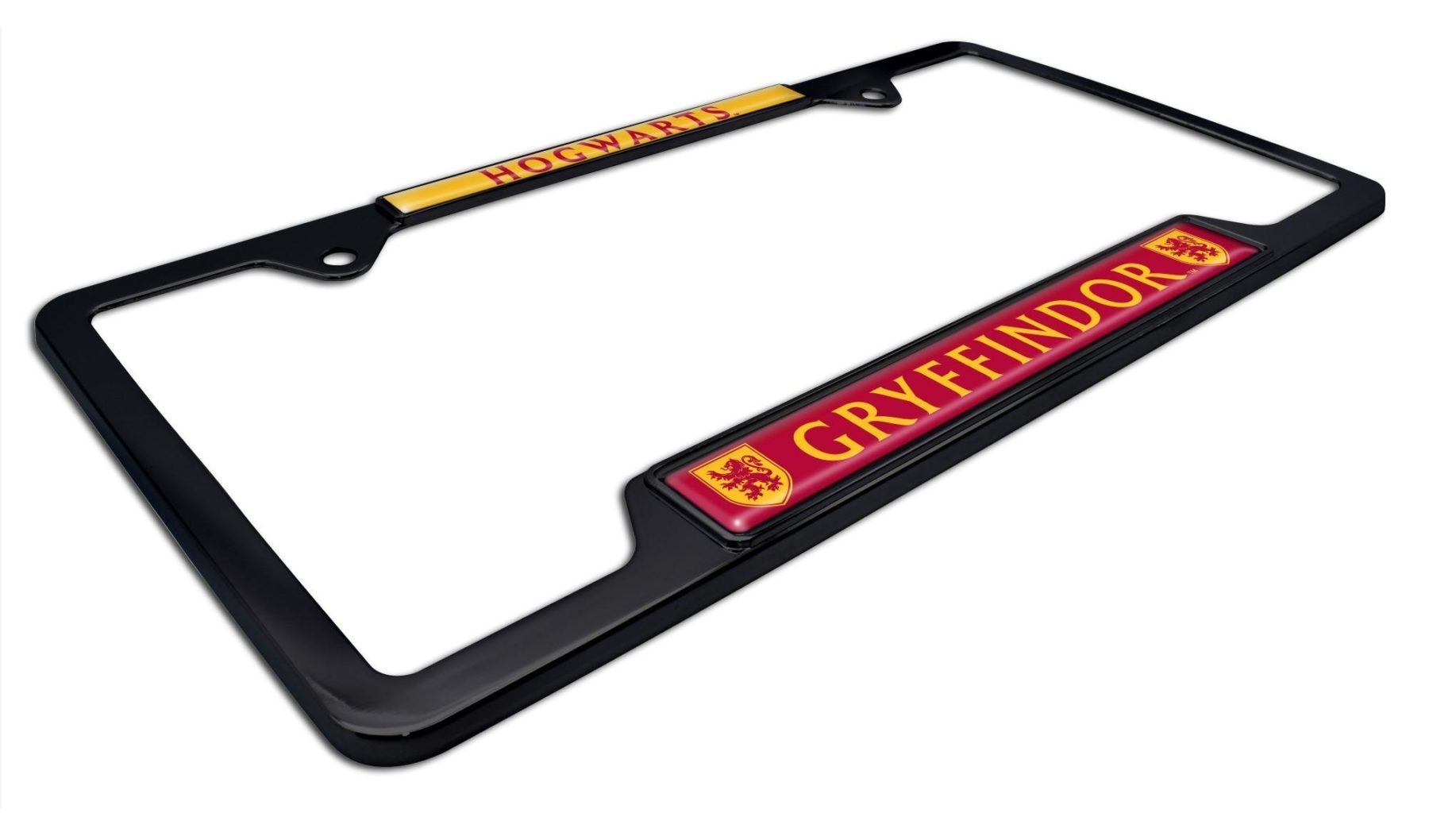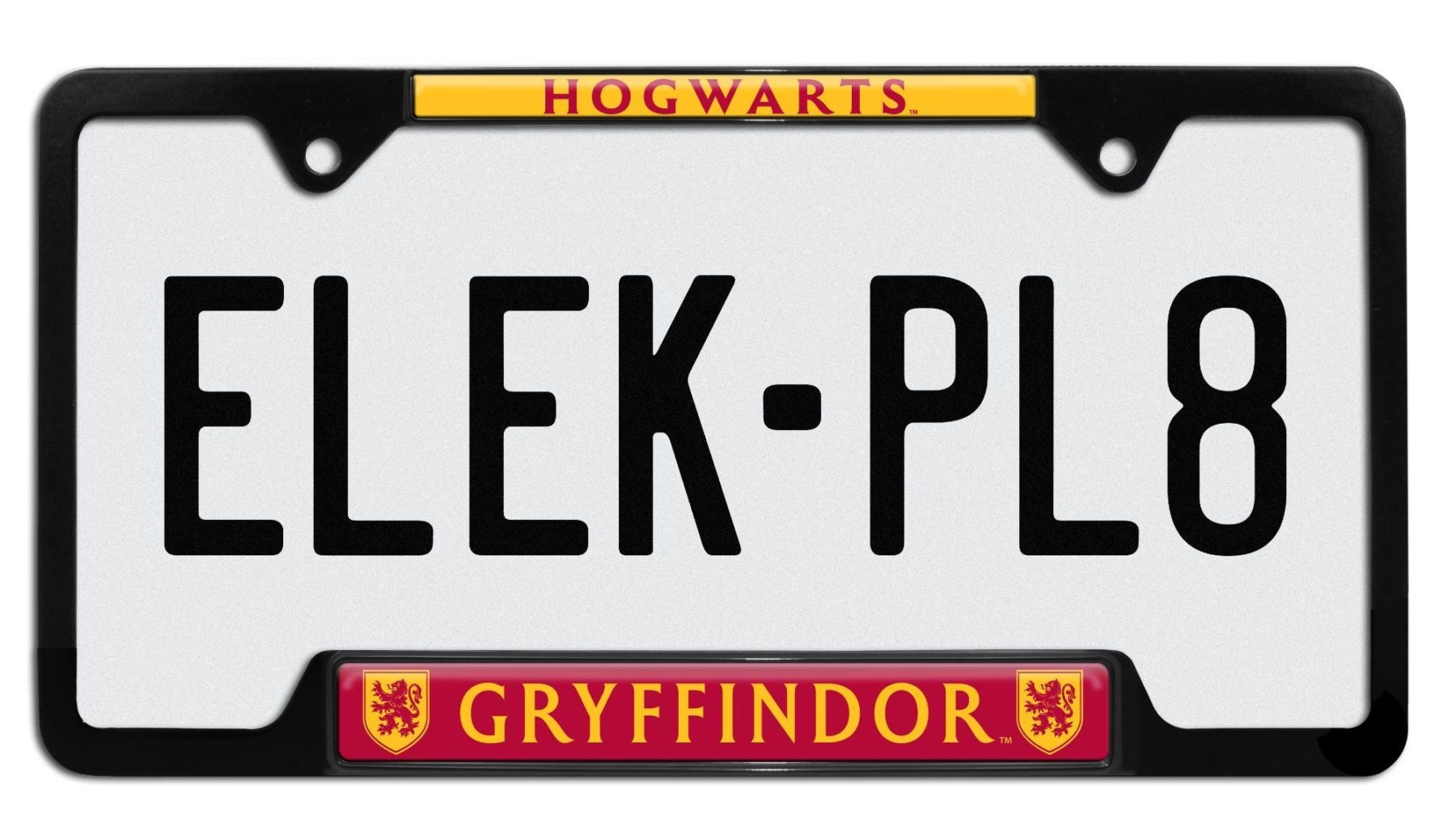 Show your Gryffindor pride with this Harry Potter license plate frame, featuring a black powder coated metal design with bold Gryffindor graphics. Designed to fit standard 12 x 6 inch US license plates, this officially licensed frame delivers a sleek look while keeping your plate fully visible.