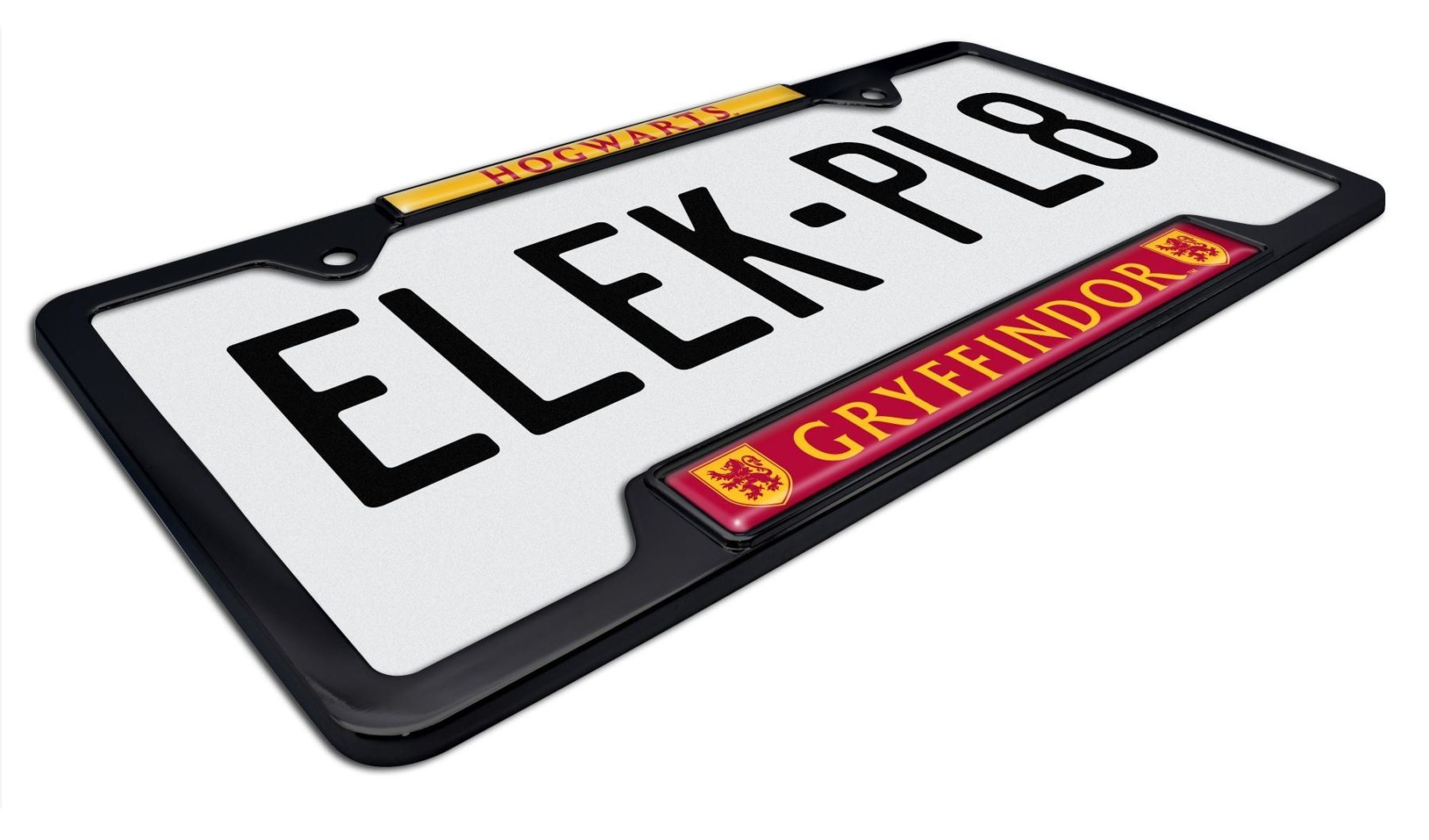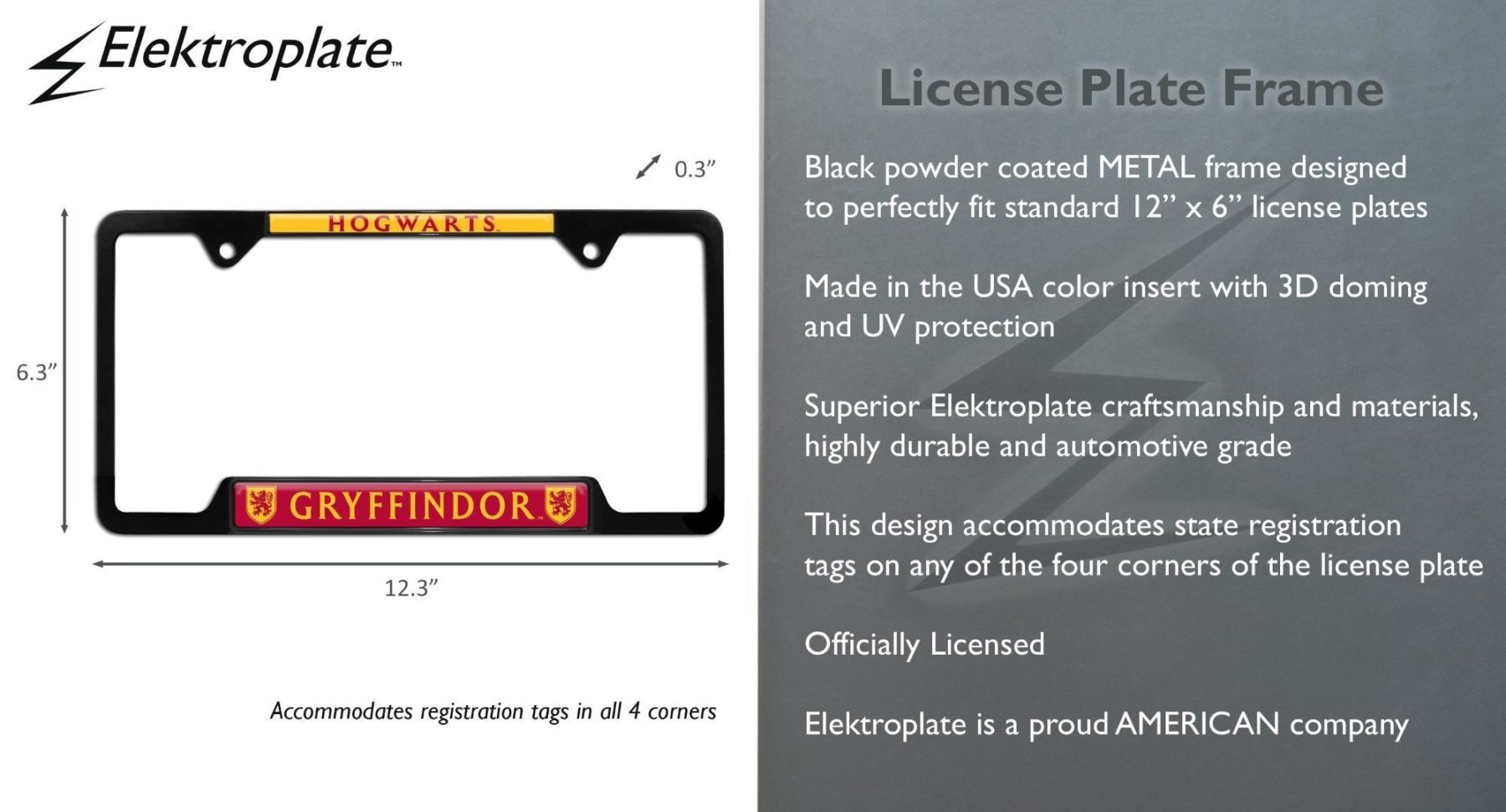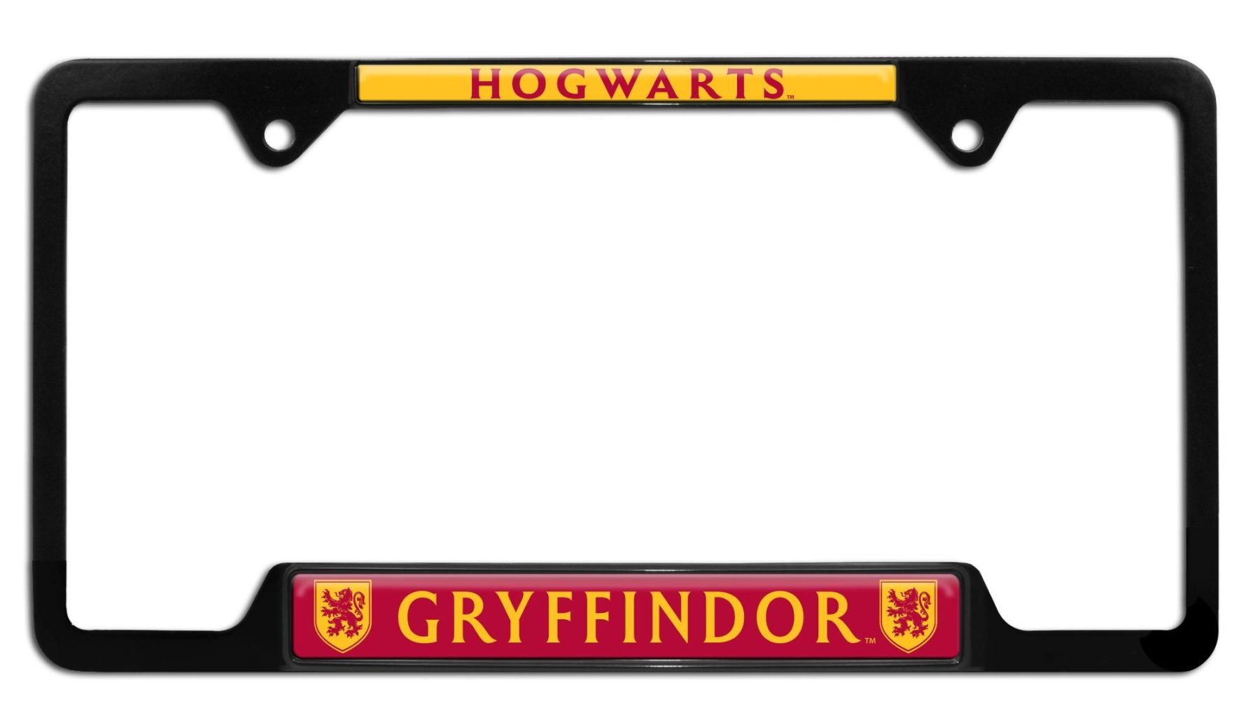 Show your Gryffindor pride with this Harry Potter license plate frame, featuring a black powder coated metal design with bold Gryffindor graphics. Designed to fit standard 12 x 6 inch US license plates, this officially licensed frame delivers a sleek look while keeping your plate fully visible.