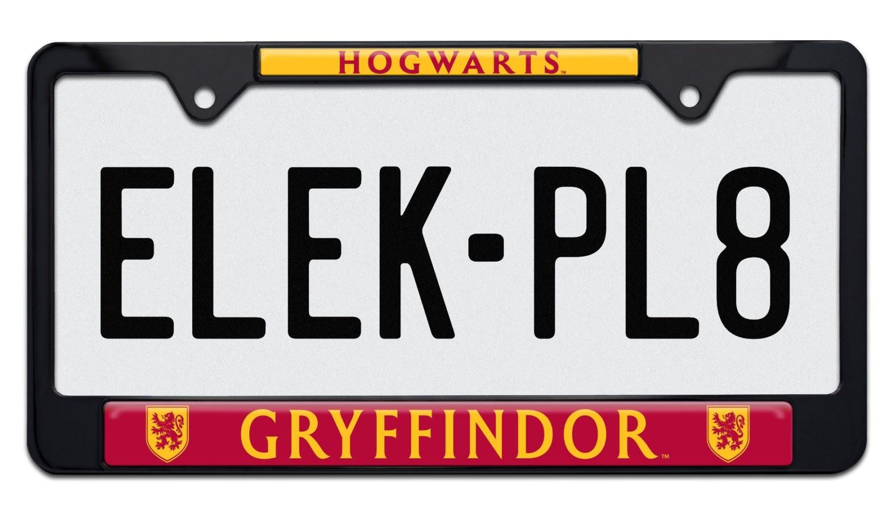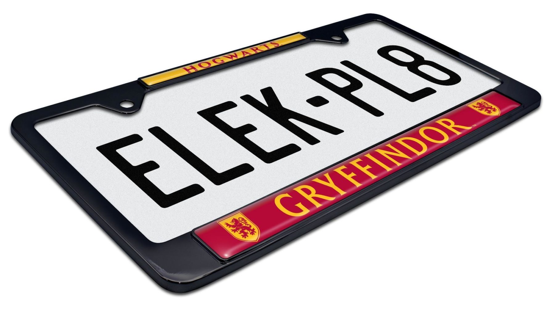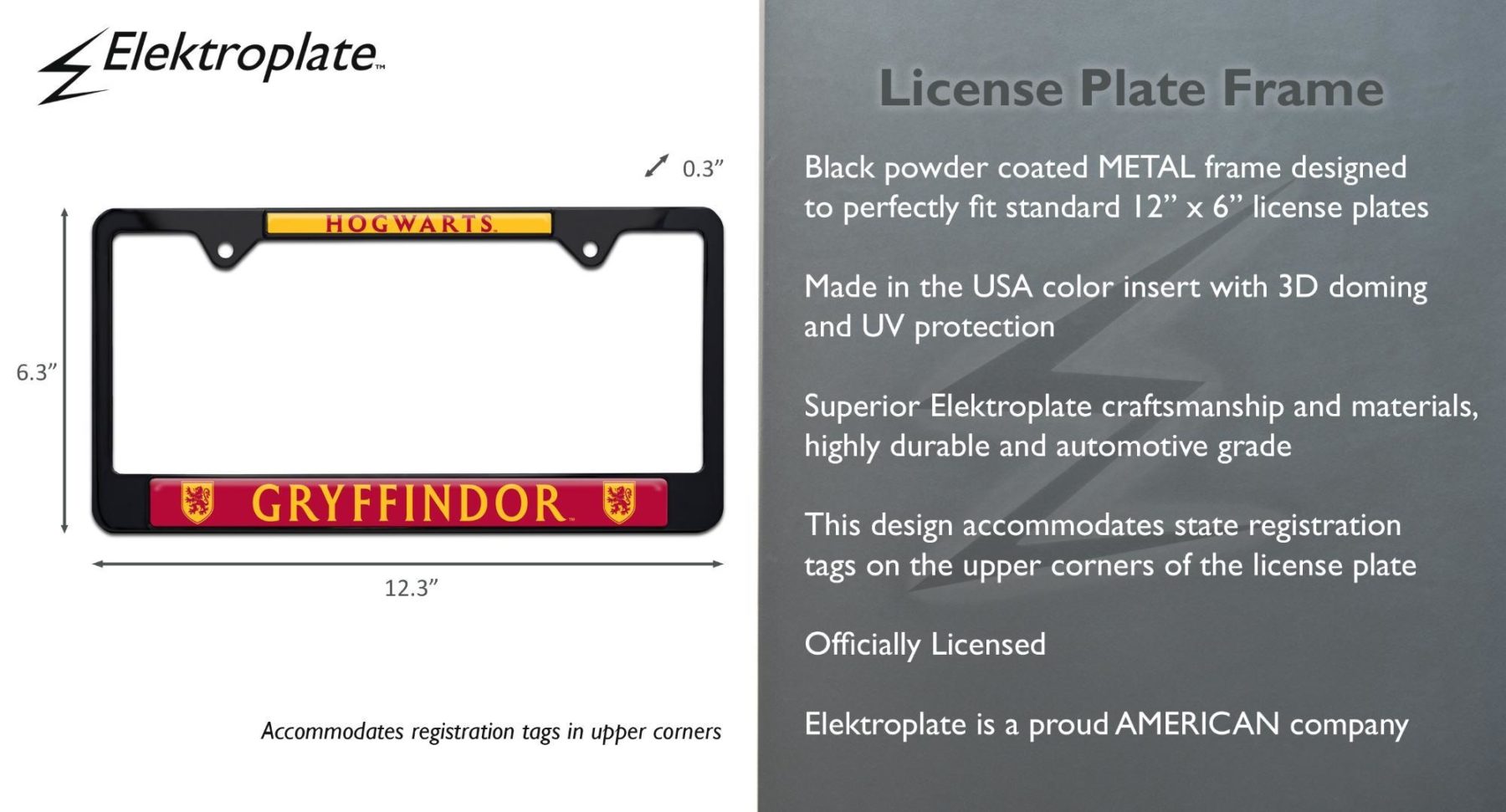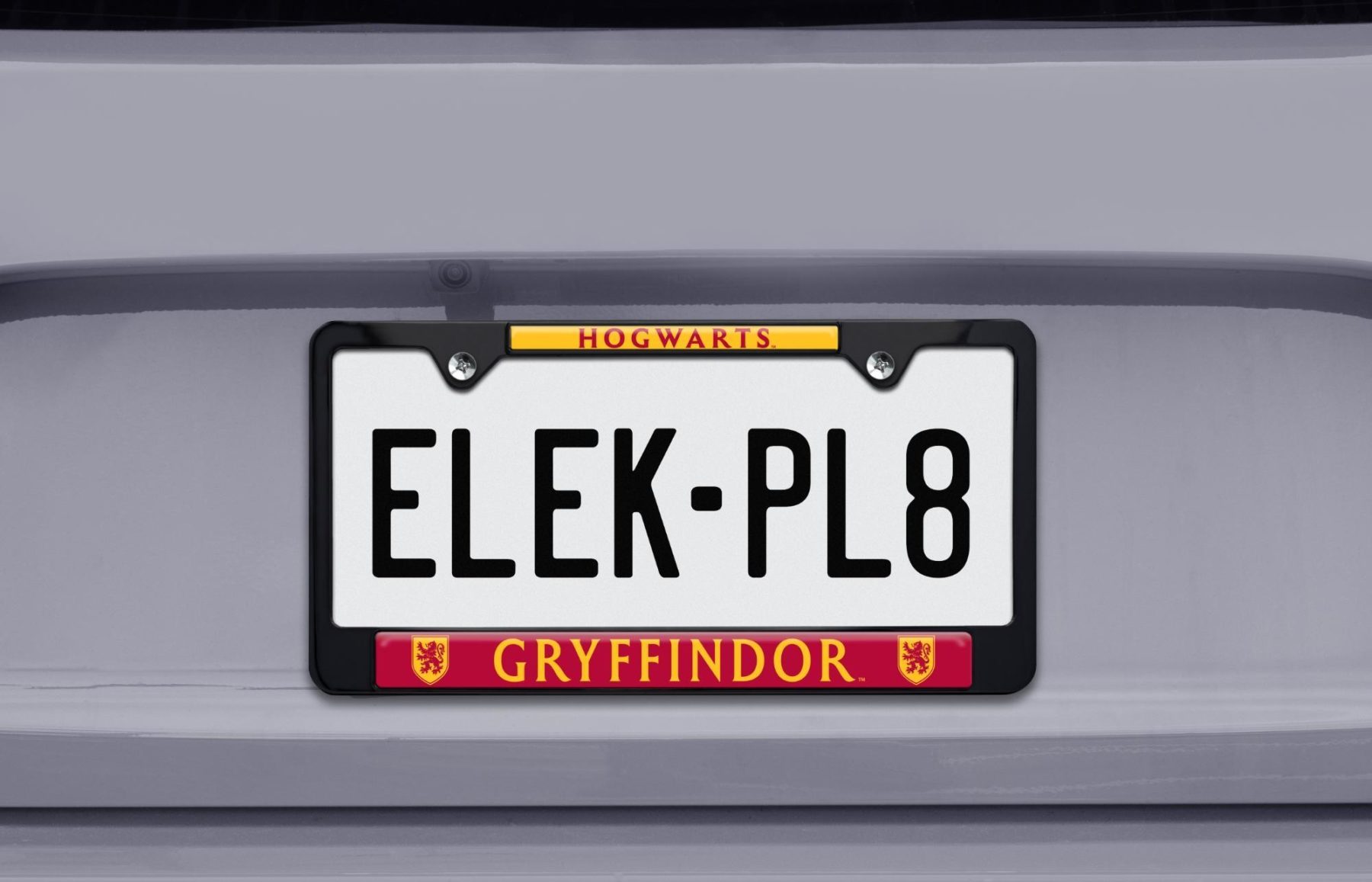 Show your Gryffindor pride with this Harry Potter license plate frame, featuring a black powder coated metal design with bold Gryffindor graphics. Designed to fit standard 12 x 6 inch US license plates, this officially licensed frame adds a clean and durable look to your car, truck, or SUV while representing your Hogwarts house.