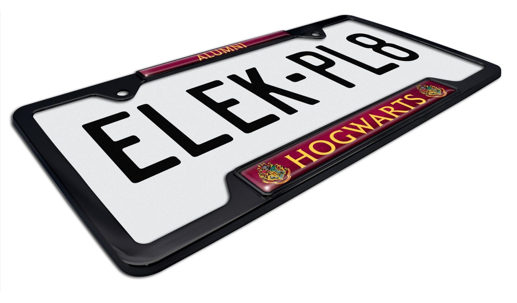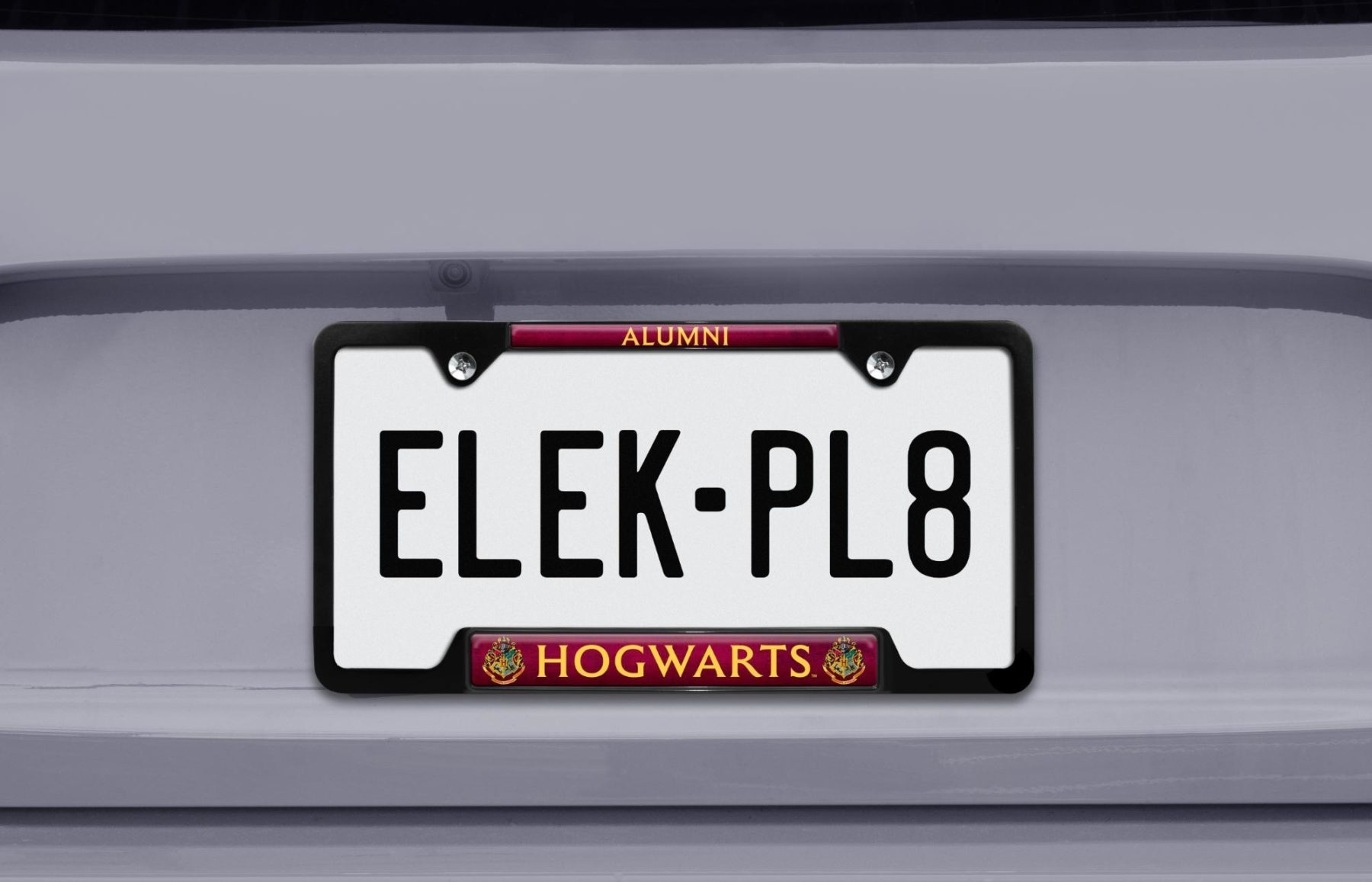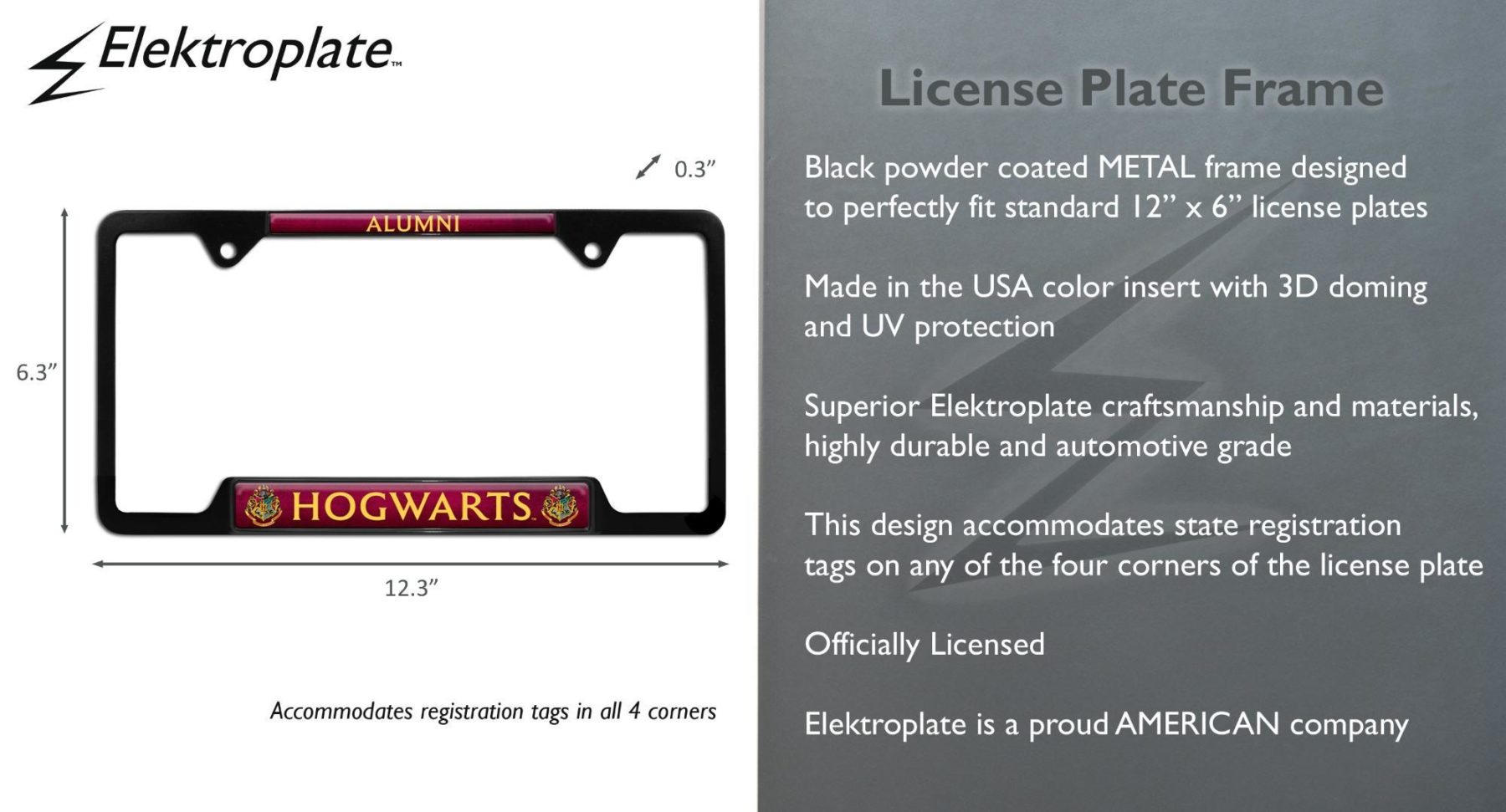 Represent Hogwarts with this Harry Potter Alumni license plate frame, featuring a black powder coated metal construction with classic graphics. Designed to fit standard 12 x 6 inch US license plates, this officially licensed frame provides a clean and modern look.