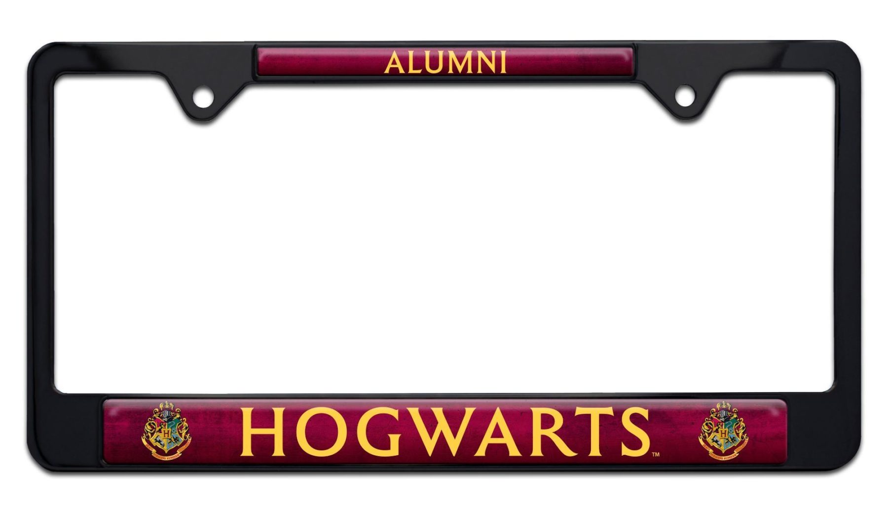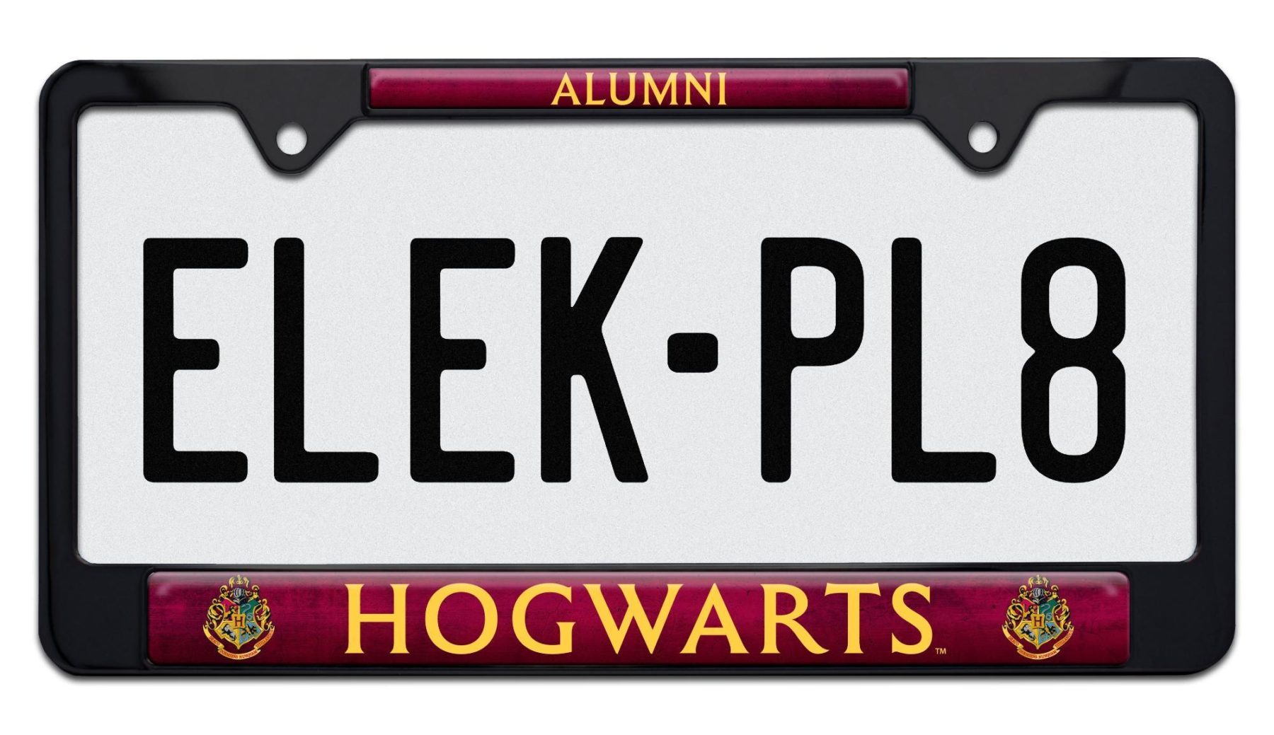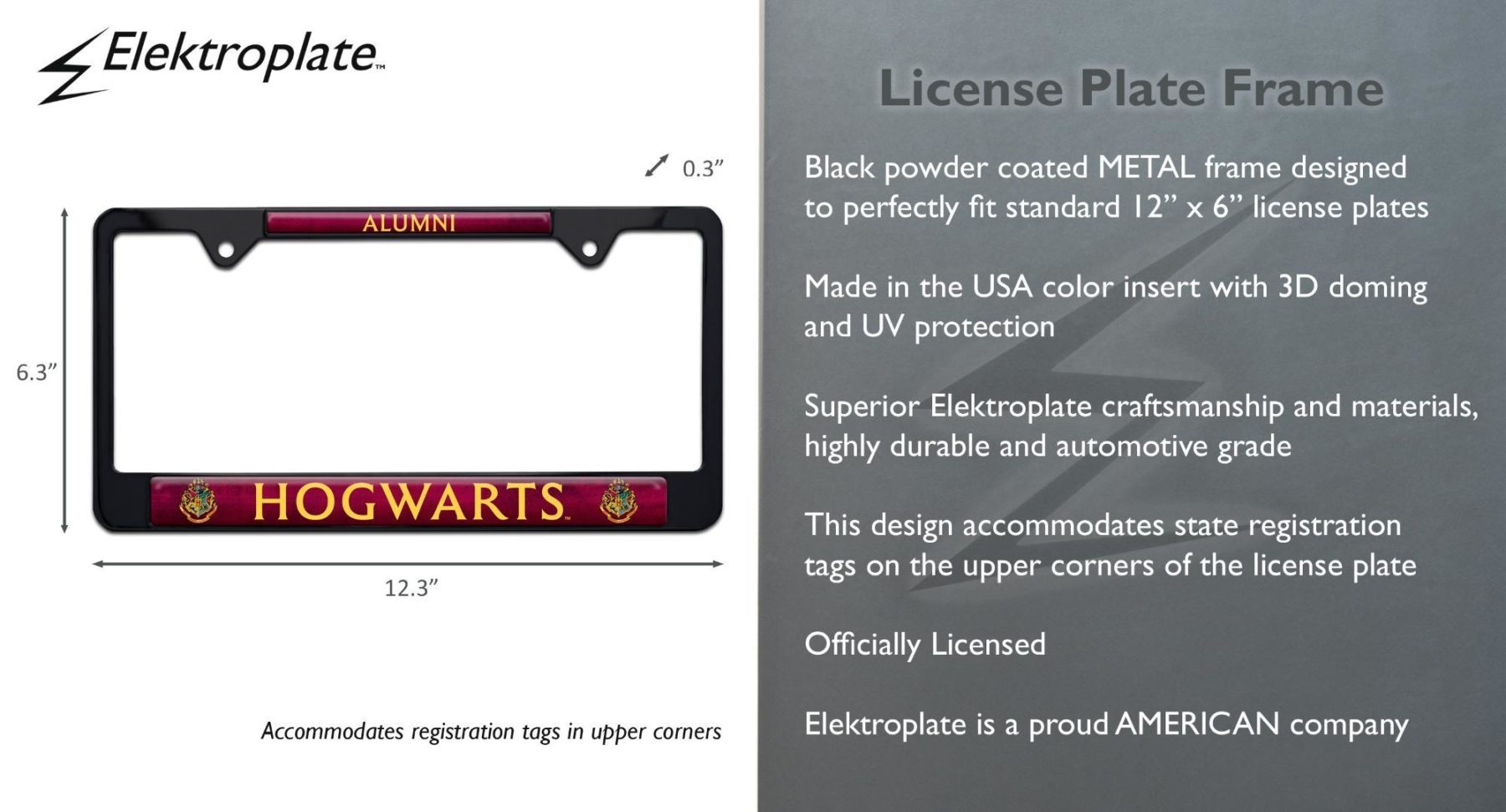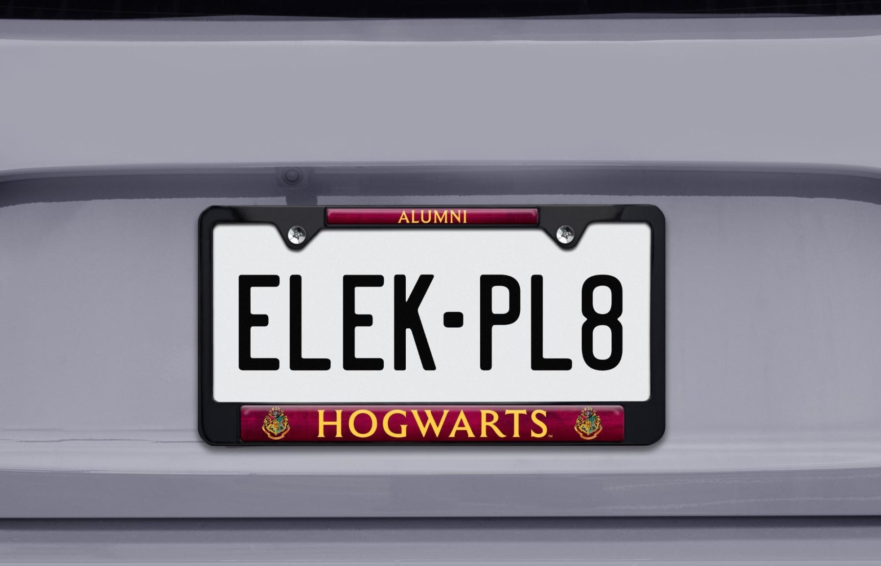 Represent Hogwarts with this Harry Potter Alumni license plate frame, featuring a black powder coated metal design with classic Hogwarts graphics. Designed to fit standard 12 x 6 inch US license plates, this officially licensed frame adds a bold and timeless look to your vehicle.