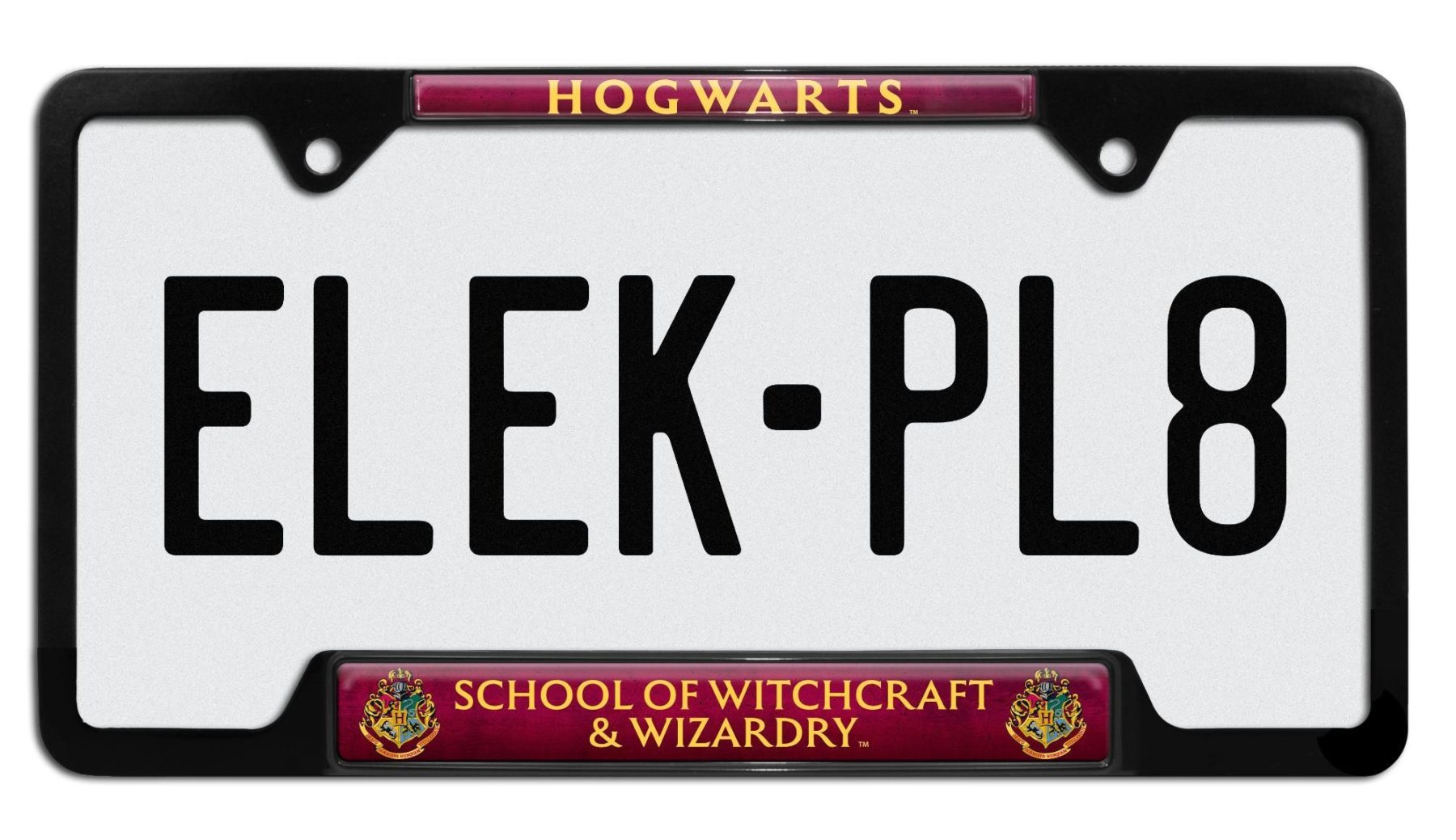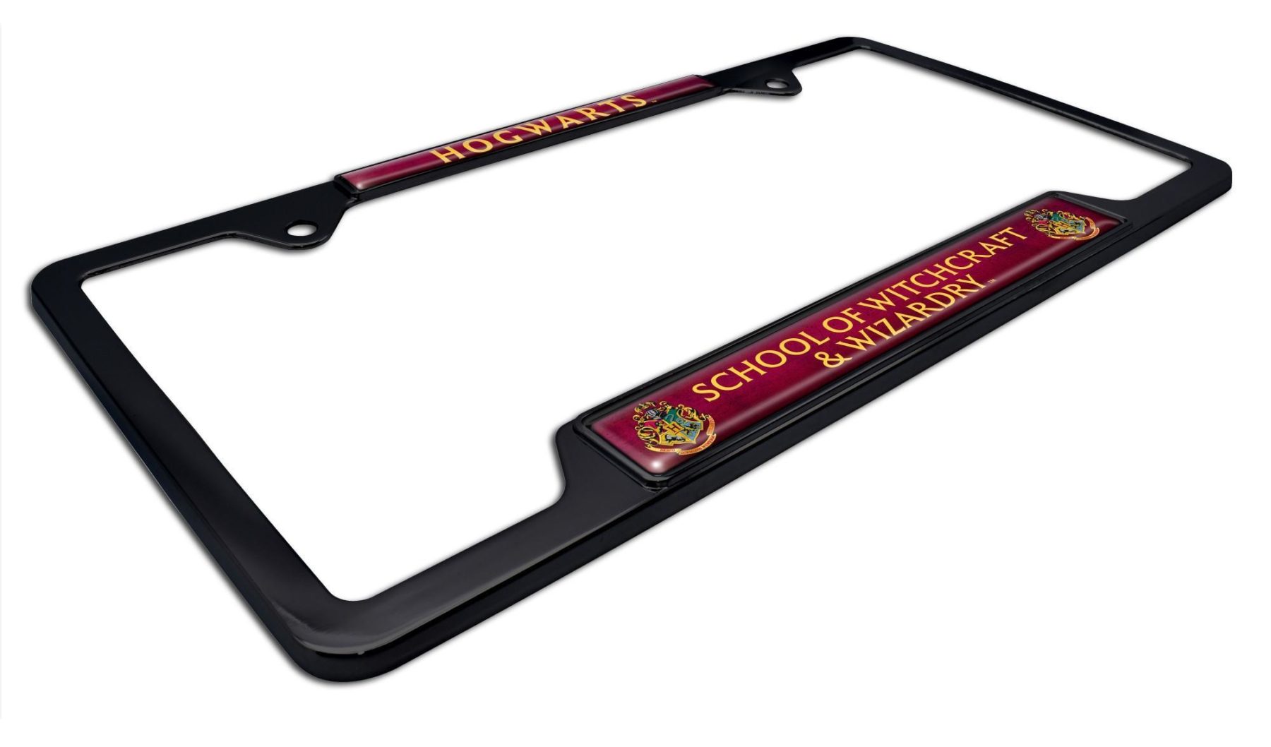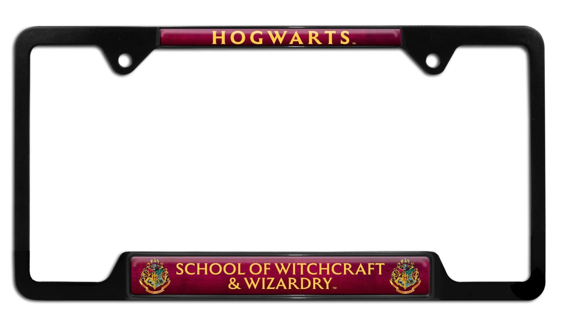 Show your Hogwarts pride with this Harry Potter license plate frame, featuring a black powder coated metal construction with classic school graphics. Designed to fit standard 12 x 6 inch US license plates, this officially licensed frame offers a clean, open design.