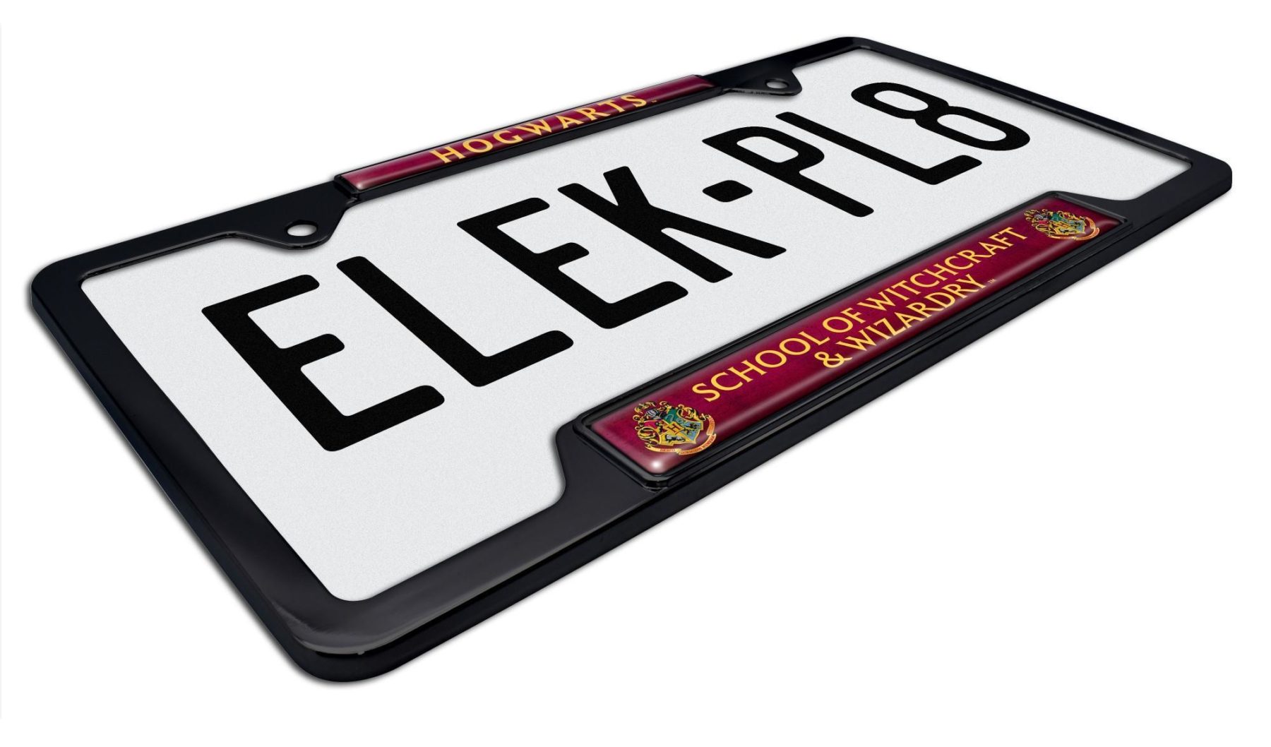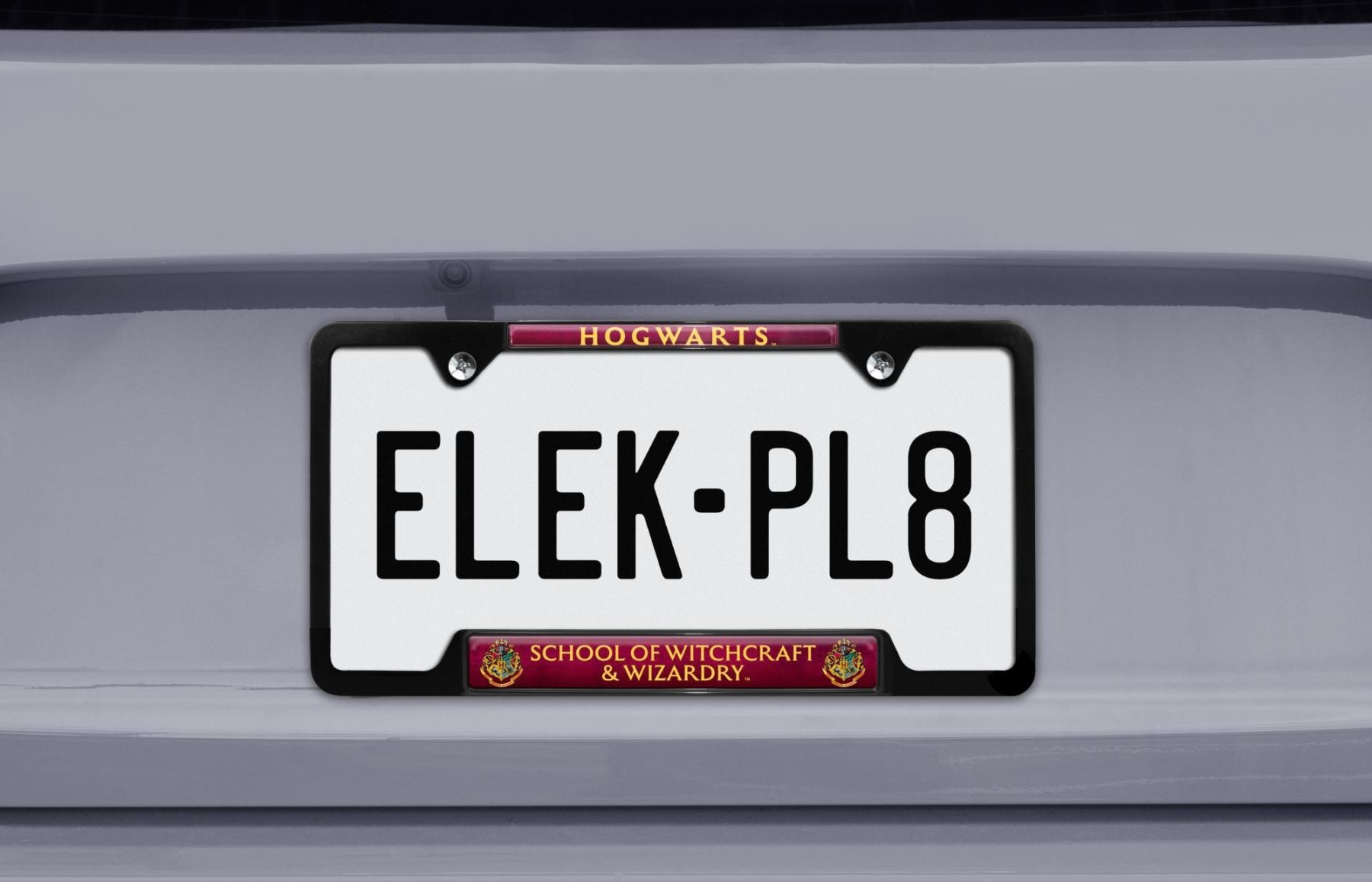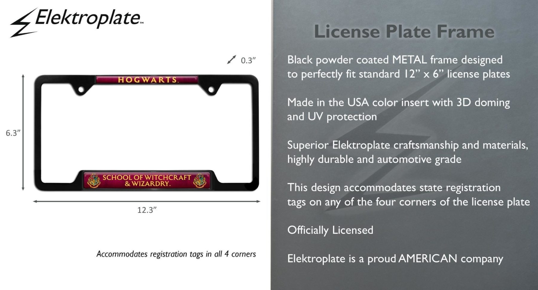 Show your Hogwarts pride with this Harry Potter license plate frame, featuring a black powder coated metal construction with classic school graphics. Designed to fit standard 12 x 6 inch US license plates, this officially licensed frame offers a clean, open design.