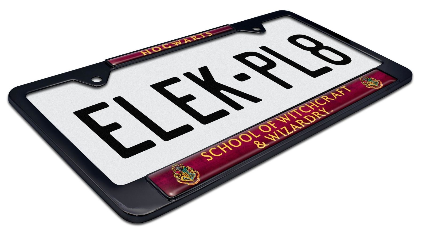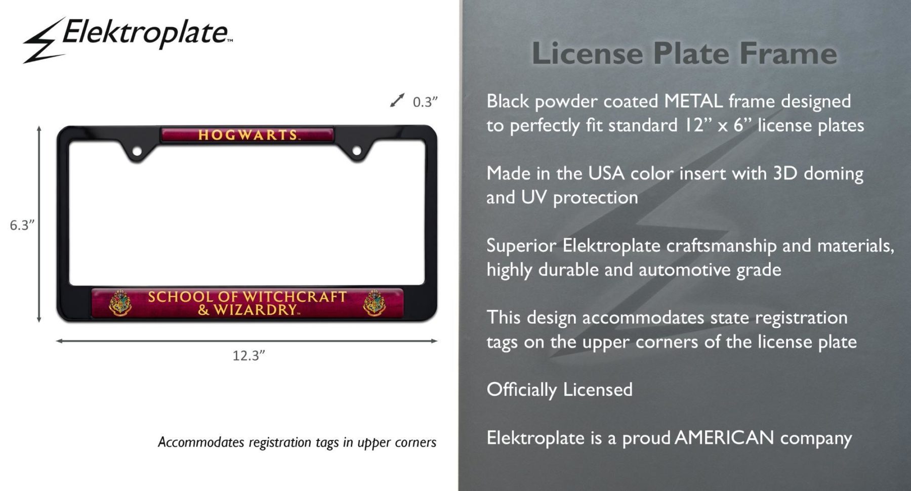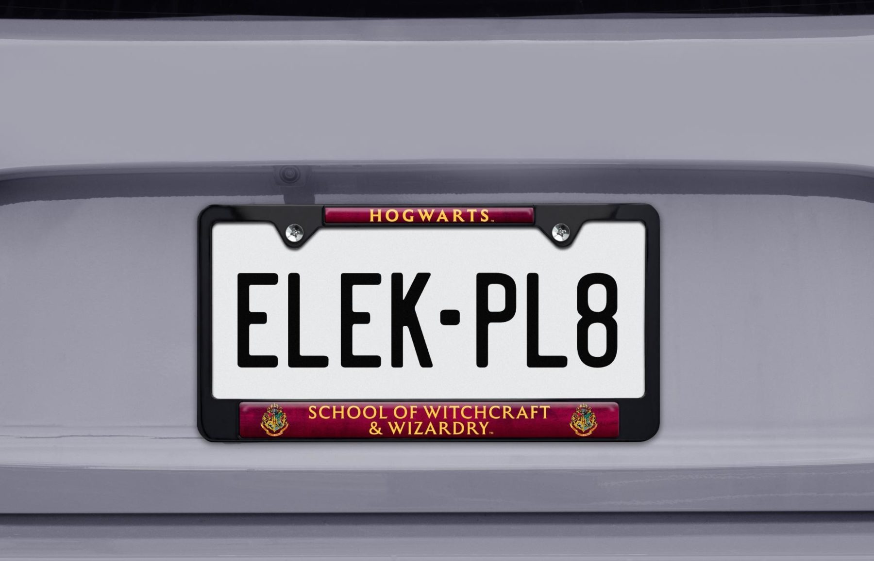 Show your Hogwarts pride with this Harry Potter license plate frame, featuring a black powder coated metal design with classic school graphics. Designed to fit standard 12 x 6 inch US license plates, this officially licensed frame adds a bold and durable touch to your vehicle.