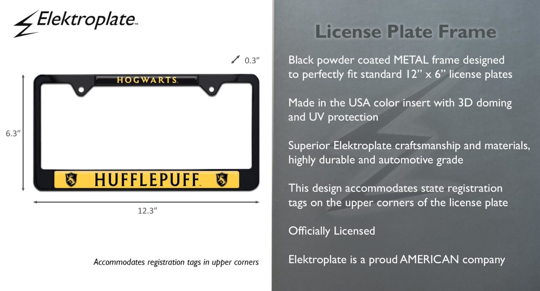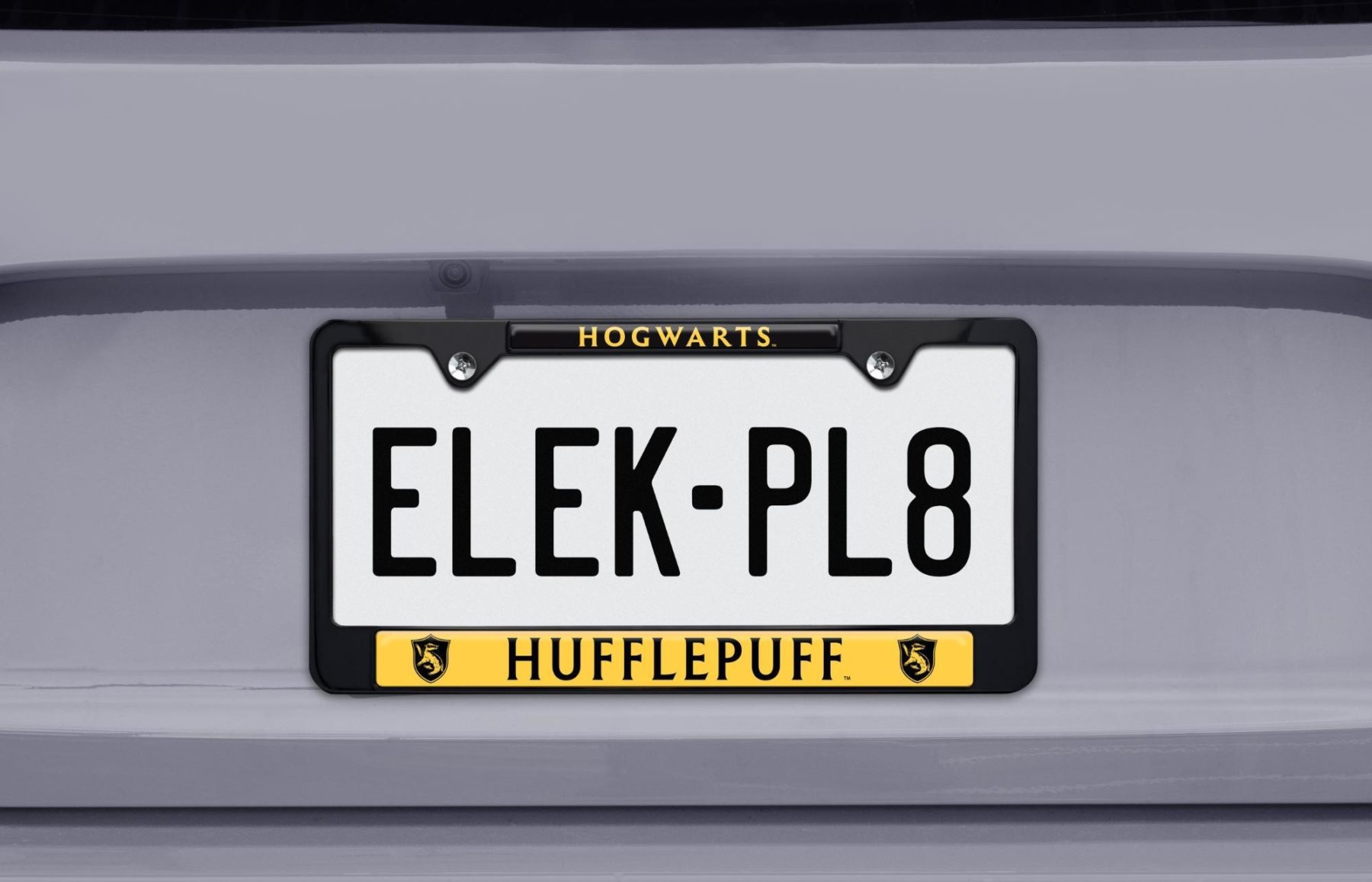 Show your Hufflepuff pride with this Harry Potter license plate frame, featuring a black powder coated metal design with bold house graphics. Designed to fit standard 12 x 6 inch US license plates, this officially licensed frame adds a durable and recognizable Hogwarts touch to your vehicle.