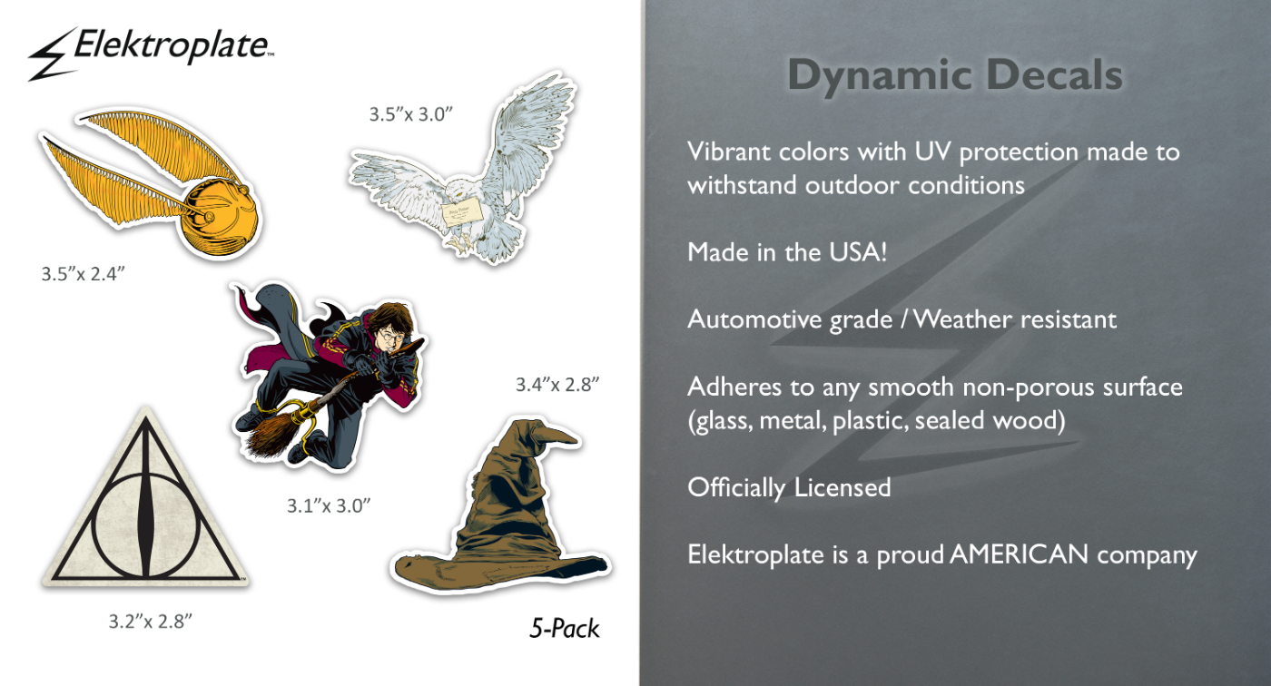 Show your love for the world of wizardry with this Officially Licensed Harry Potter decal 5-pack. Featuring 5 iconic designs (approximately 3"), this set brings Hogwarts to life in bold, vibrant colors. Whether you’re a fan of the books or blockbuster films, these decals are perfect for celebrating your favorite wizards.