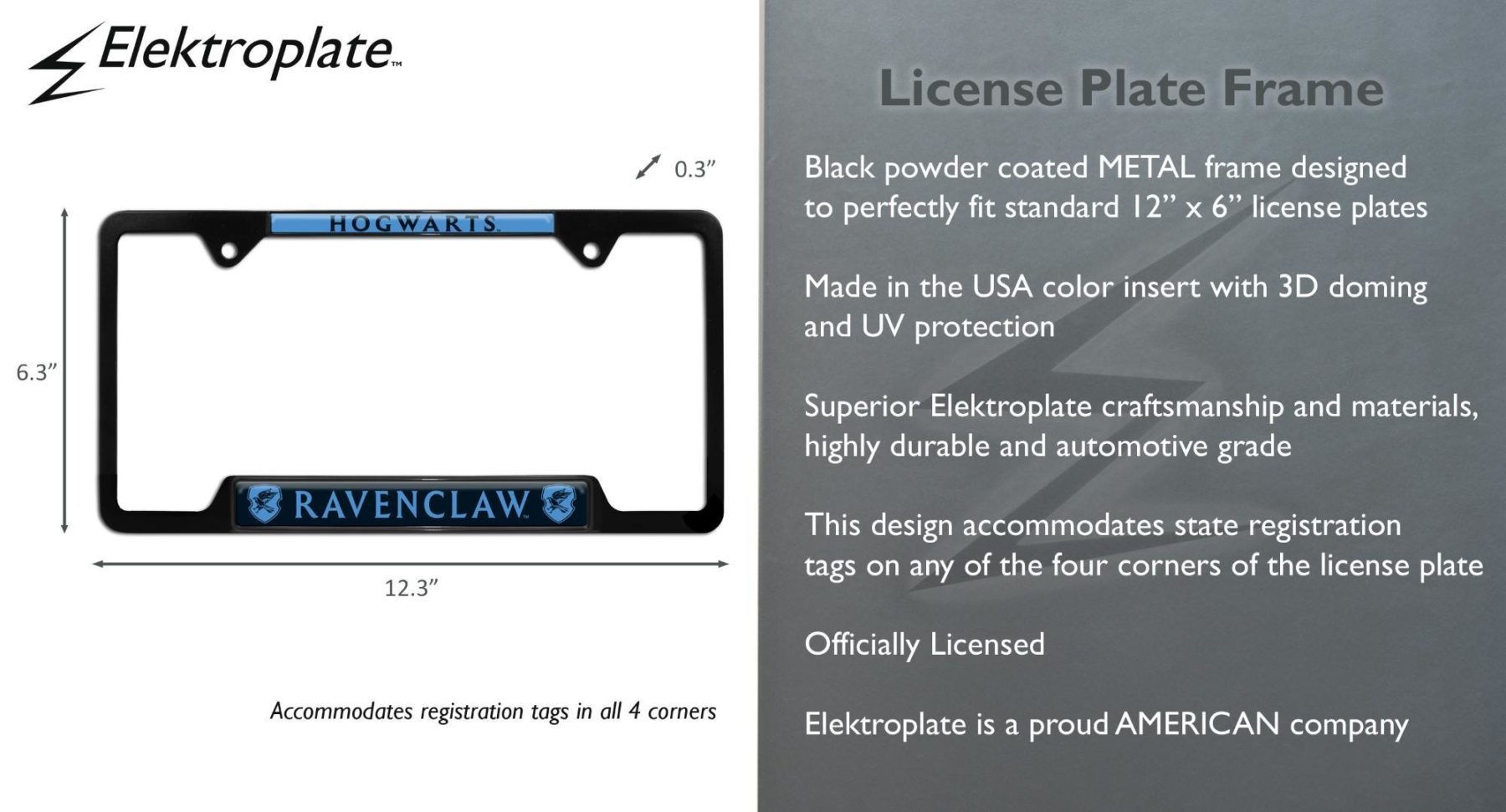 Show your Ravenclaw pride with this Harry Potter license plate frame, featuring a black powder coated metal construction with bold house graphics. Designed to fit standard 12 x 6 inch US license plates, this officially licensed frame offers a sleek, open design.