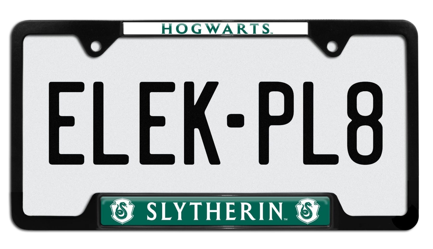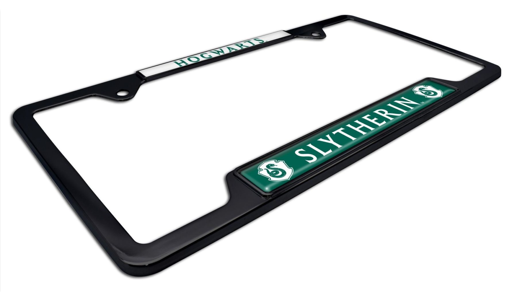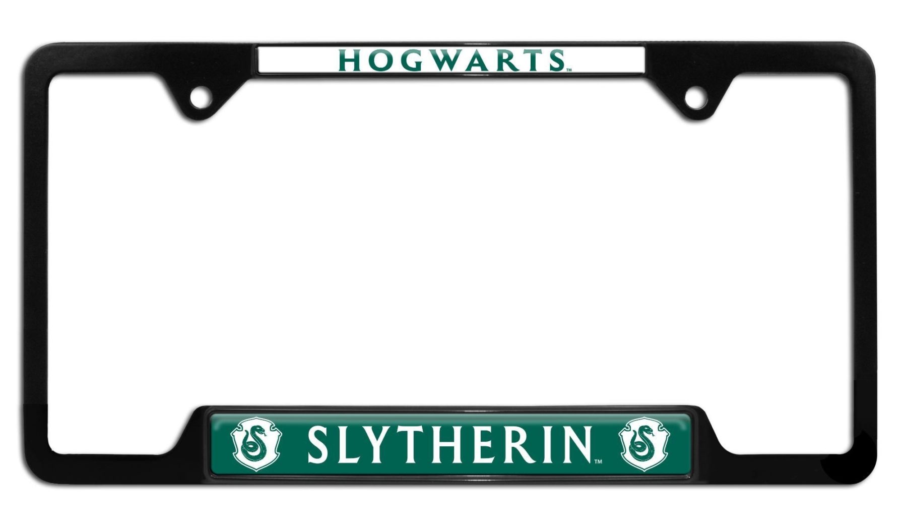 Show your Slytherin pride with this Harry Potter license plate frame, featuring a black powder coated metal construction with bold house graphics. Designed to fit standard 12 x 6 inch US license plates, this officially licensed frame provides a sleek and modern look.