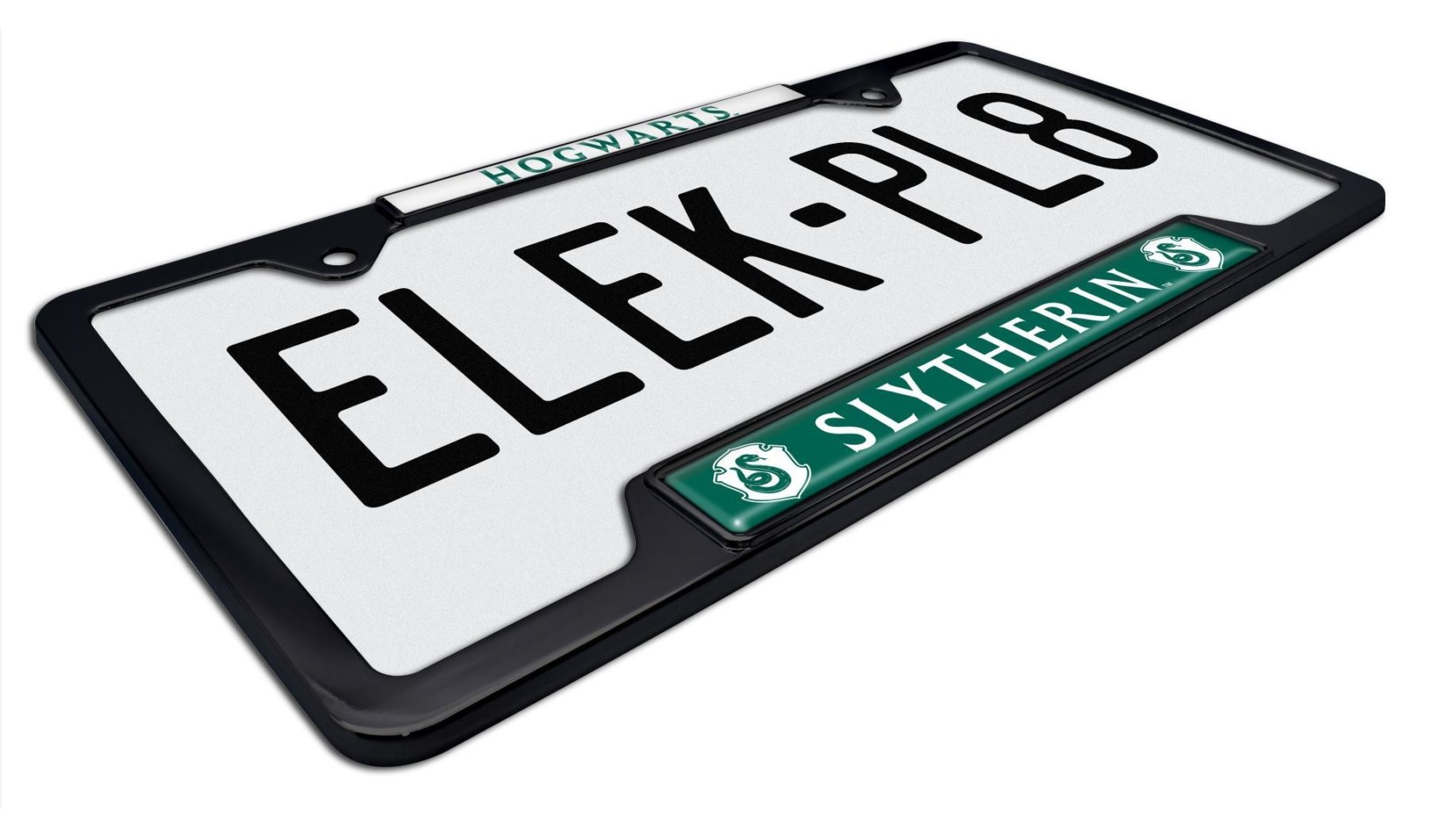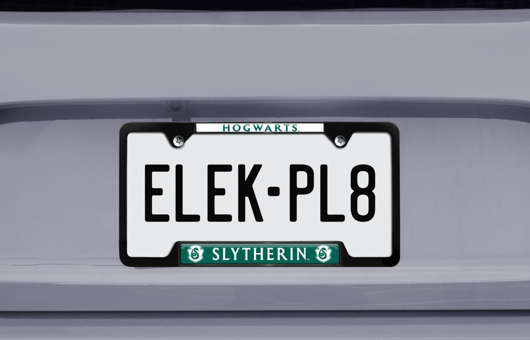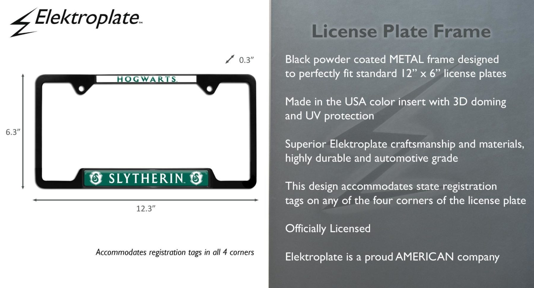 Show your Slytherin pride with this Harry Potter license plate frame, featuring a black powder coated metal construction with bold house graphics. Designed to fit standard 12 x 6 inch US license plates, this officially licensed frame provides a sleek and modern look.