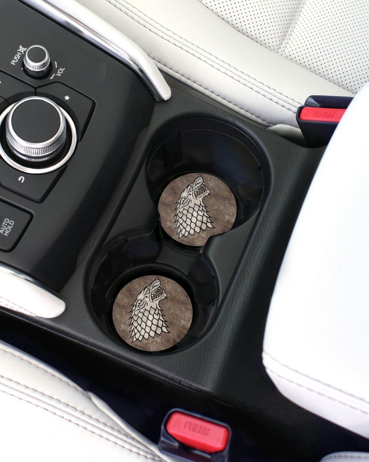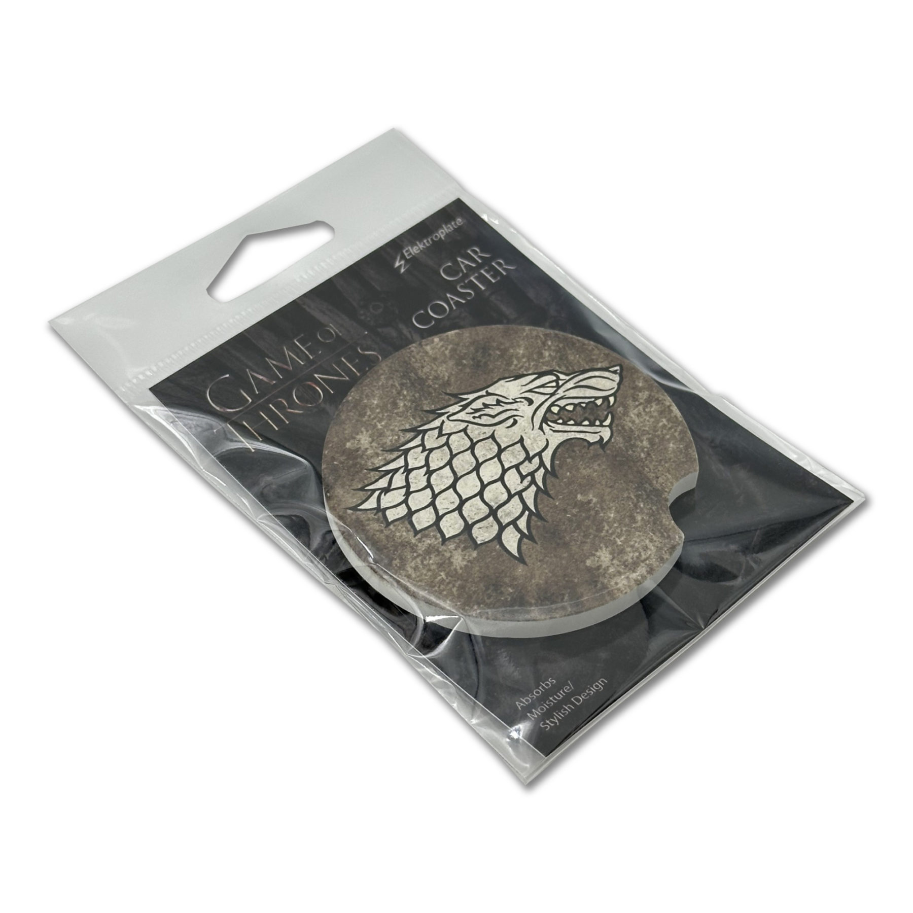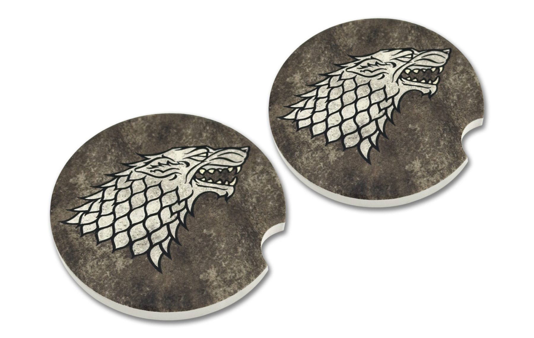 Show your allegiance to the loyal House Stark with these Officially Licensed Game of Thrones car coasters! Each set includes two absorbent coasters designed to keep your cup holders dry and clean and offer a universal fit (2.6" diameter) for most vehicle cup holders. Crafted with care, these high-quality car coasters not only protect your car, but also add a touch of personality to your space. Easy to clean and durable enough for everyday use, they’re the ideal accessory to showcase your style on the go.