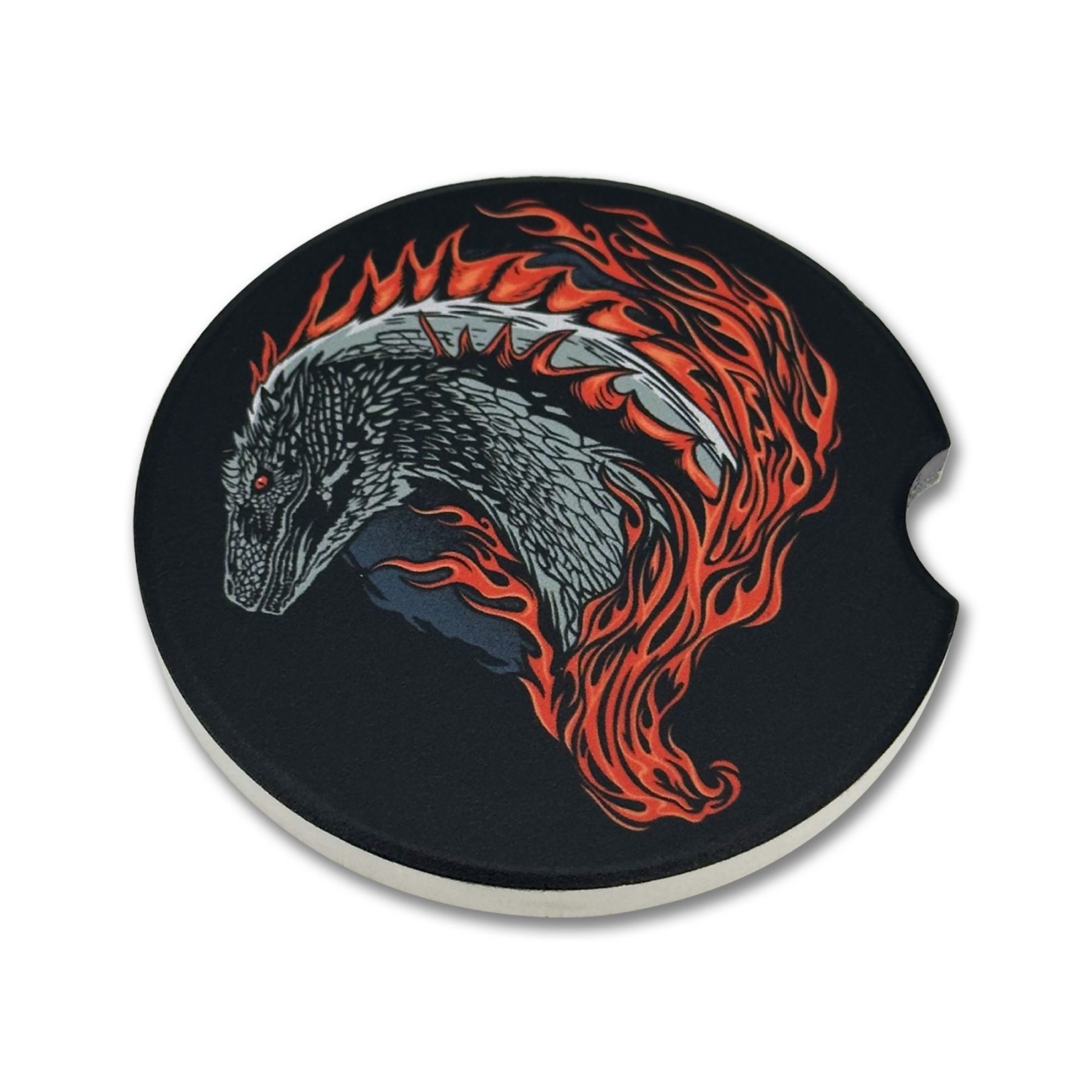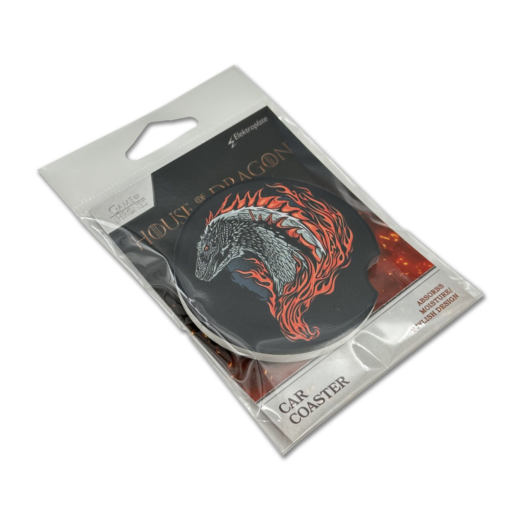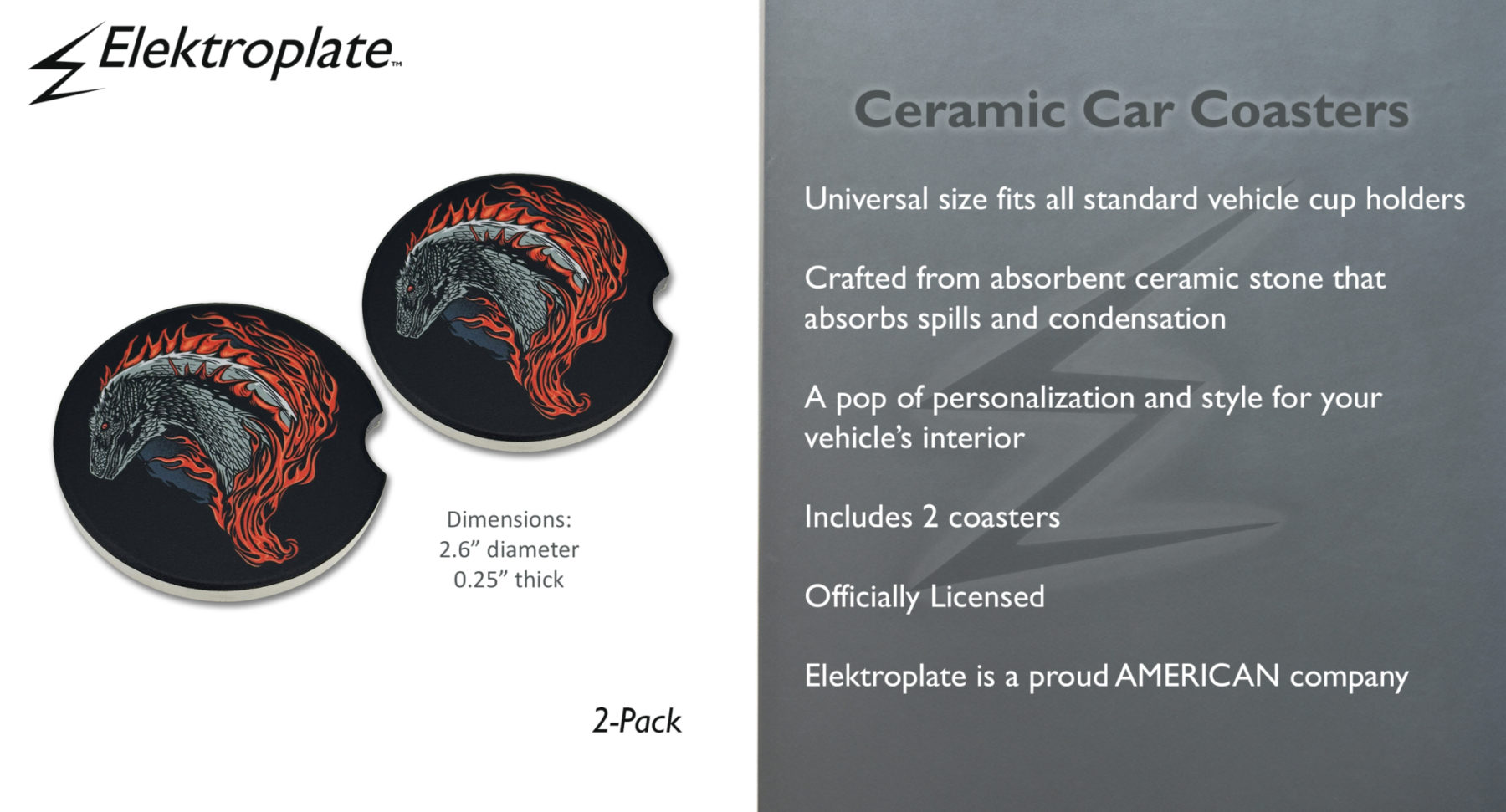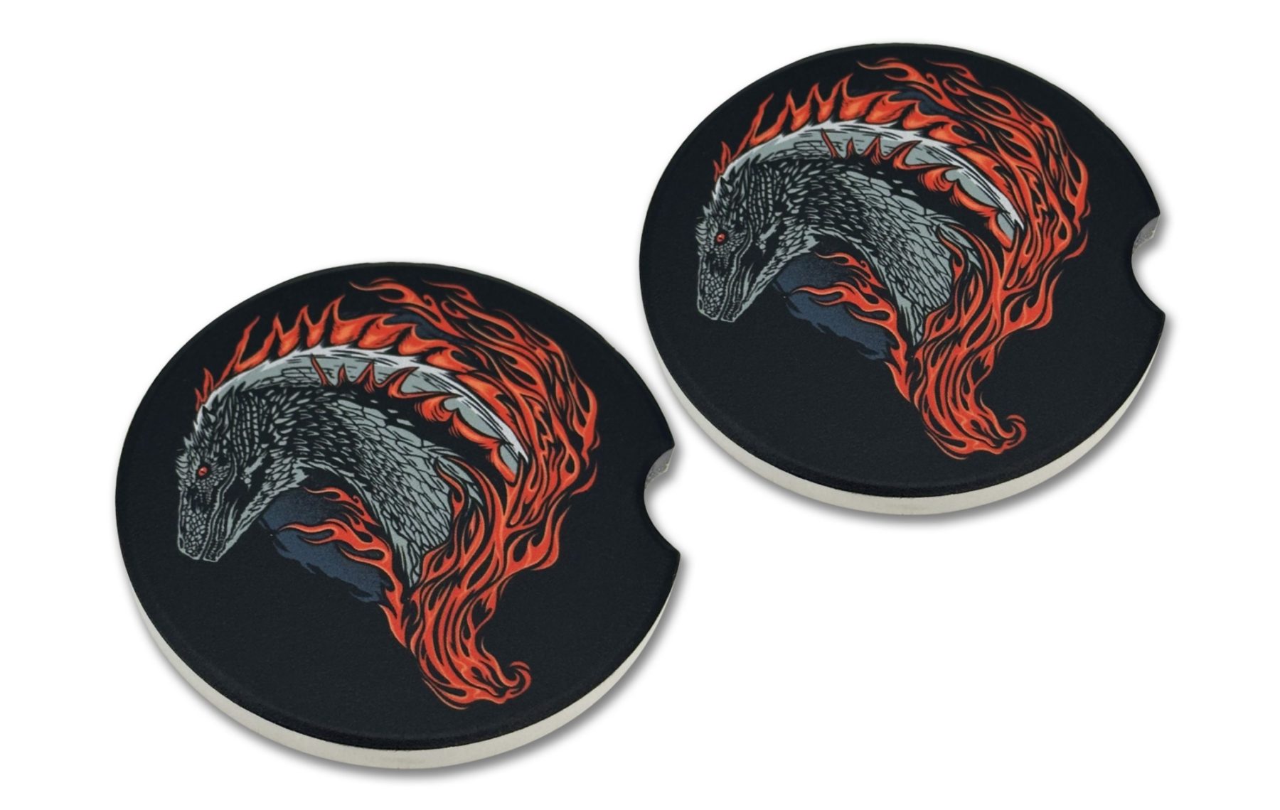 Bring the fiery world of House of the Dragon to your car with these Officially Licensed Flame Dragon car coasters! Each set includes two absorbent coasters designed to keep your cup holders dry and clean and offer a universal fit (2.6" diameter) for most vehicle cup holders. Crafted with care, these high-quality car coasters not only protect your car, but also add a touch of personality to your space. Easy to clean and durable enough for everyday use, they’re the ideal accessory to showcase your style on the go.