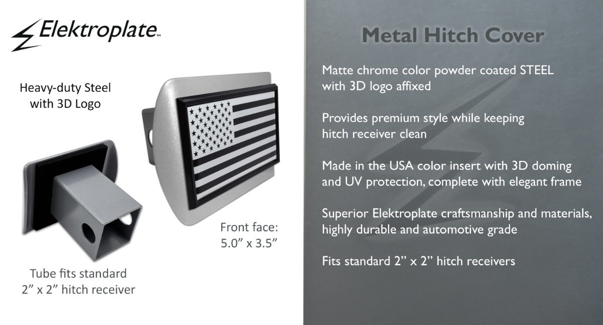 American Flag ALL-METAL hitch cover (front plate measures 5” x 3.5”) by Elektroplate offers premium quality and standout appearance, far above cheaper plastic and pewter alternatives. It features an OEM ABS plastic core with a chrome-plated metal finish American flag emblem, securely mounted on a sleek brushed chrome all-metal hitch cover base. Designed to fit standard 2” trailer hitch receivers—if it doesn’t fit perfectly, you may return it for a full refund.