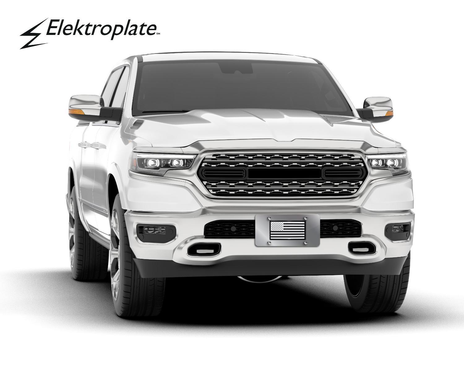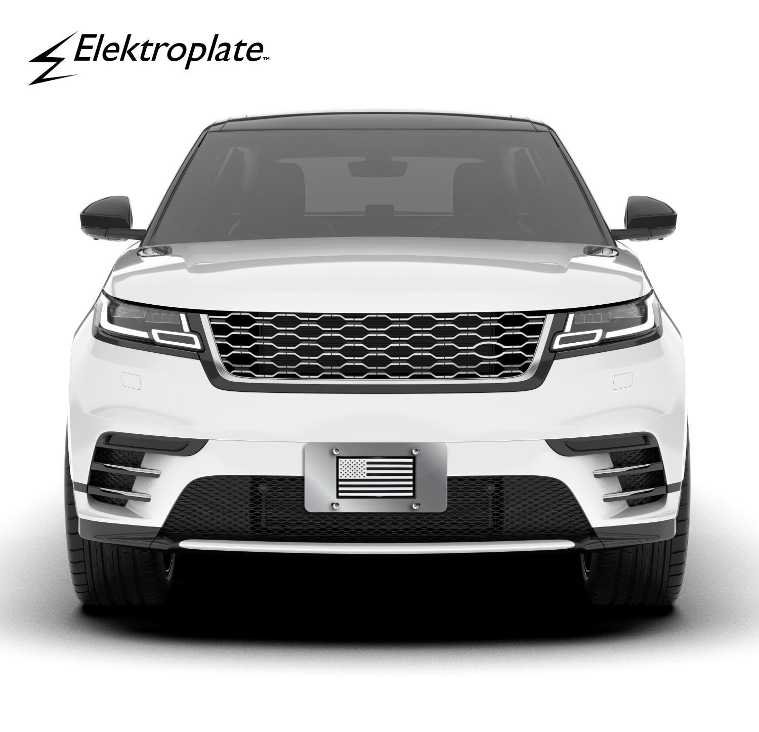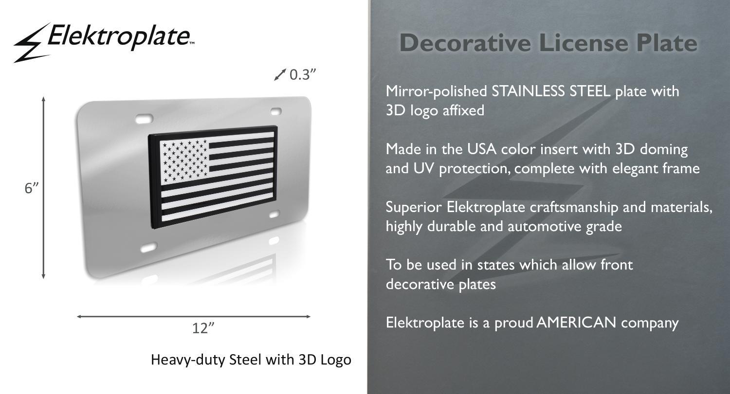 Make a bold statement with the all-metal Black and White American Flag front license plate by Elektroplate (12” x 6”). Featuring a sleek black-and-white rendition of the U.S. flag, this design offers a modern, understated take on traditional patriotism. The UV-protected decal with 3D doming is mounted on a durable stainless steel all-metal base with an OEM-quality frame, creating a sharp and polished look.