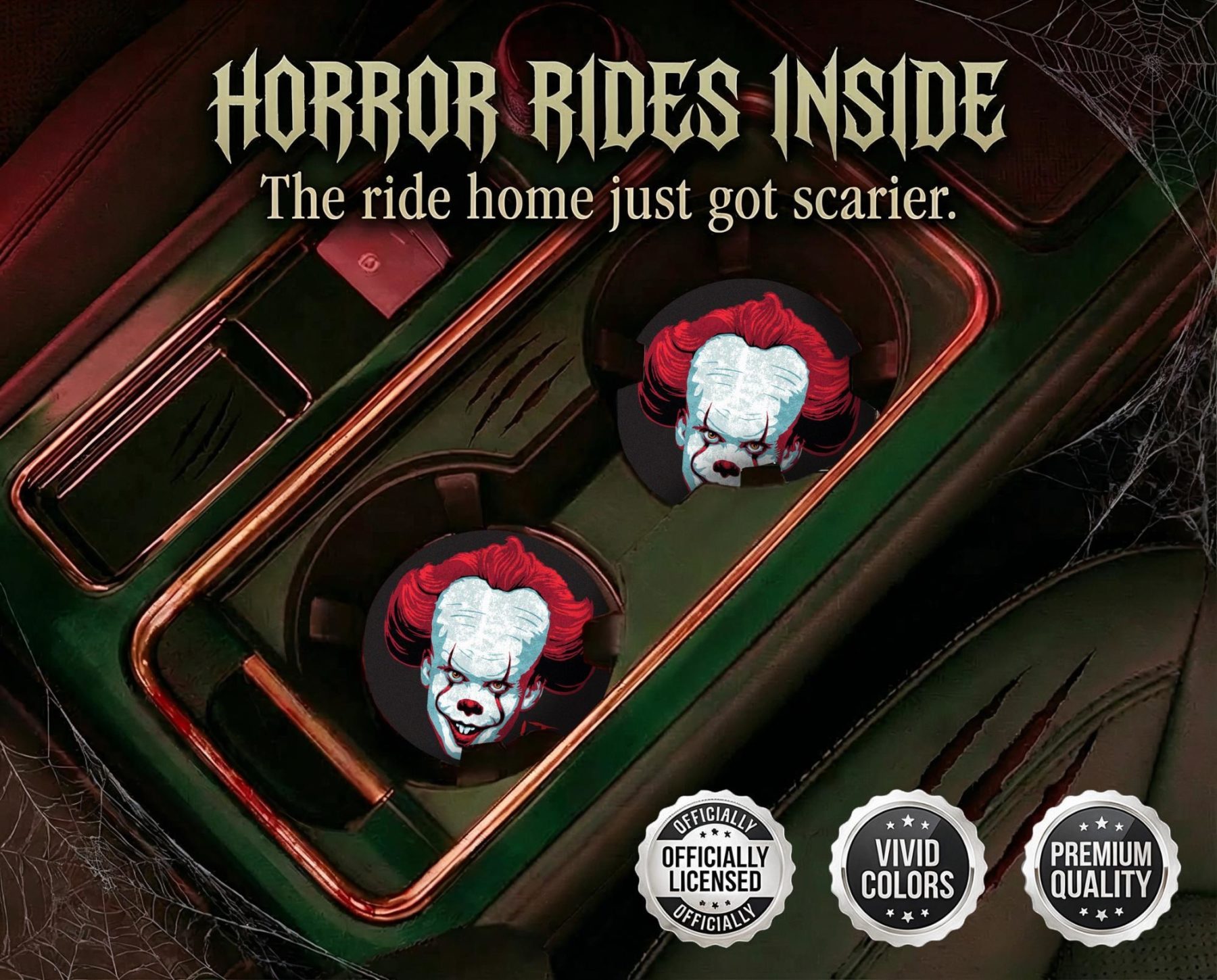 Keep your ride clean and stylish with Elektroplate's Officially Licensed Pennywise IT Movie Car Coasters (Set of 2). These 2.6" diameter coasters are designed to fit all standard cup holders and absorb spills and condensation while maintaining their vivid colors. Crafted with care, these high-quality car coasters not only protect your car, but also add a touch of personality to your space. Easy to clean and durable enough for everyday use, they’re the ideal accessory to showcase your style on the go.
