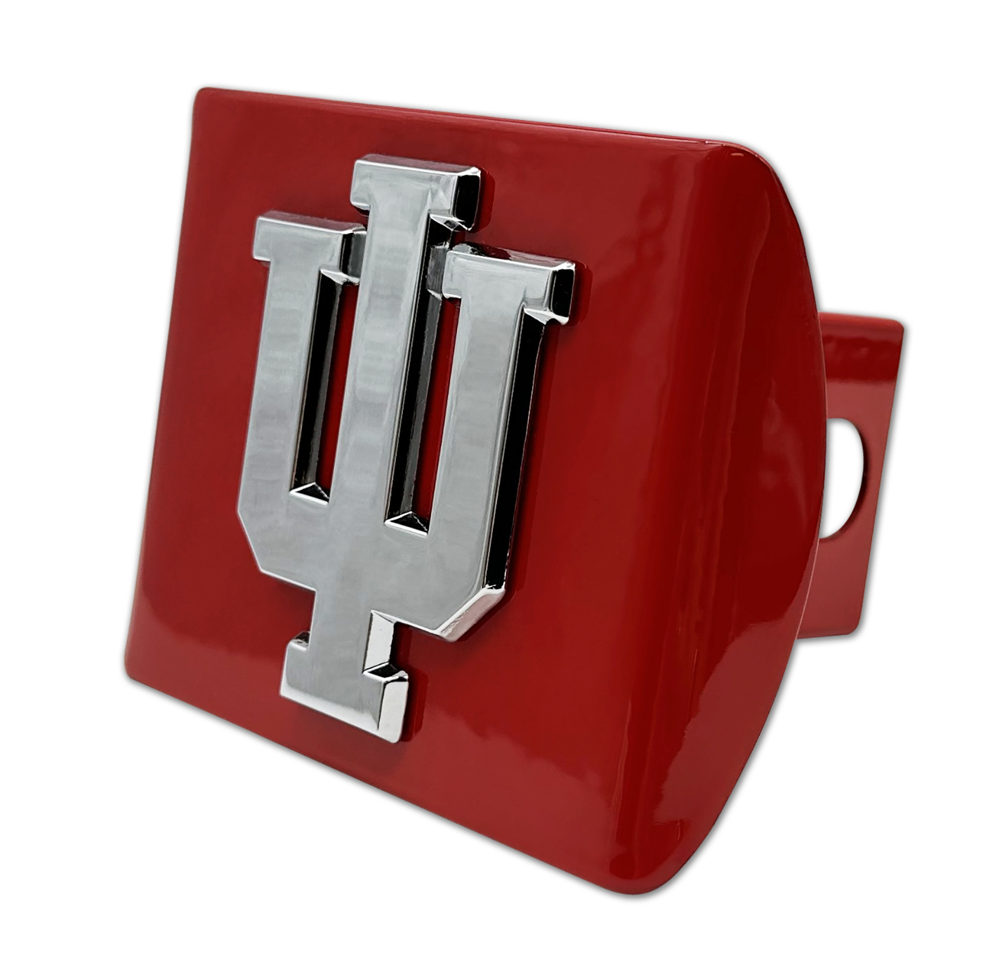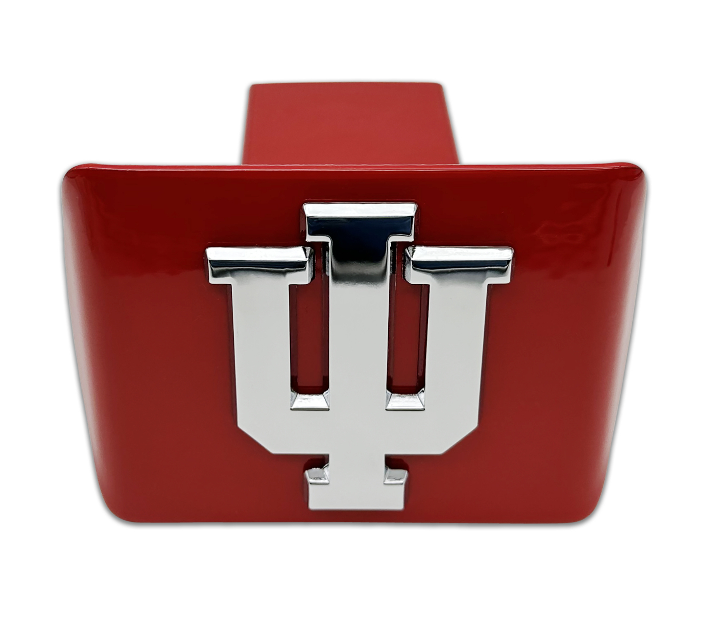 Officially licensed - Indiana University ALL-METAL hitch cover (front plate is 5" x 3.5”) by Elektroplate. A step above in quality and appearance over cheaper plastic and pewter versions. Comprised of an all-metal Indiana University "IU" emblem adhered to a red powder coated all-metal hitch cover mount. The hitch cover fits standard 2” trailer hitch receivers (if it does not fit perfectly, you may return for a full refund).