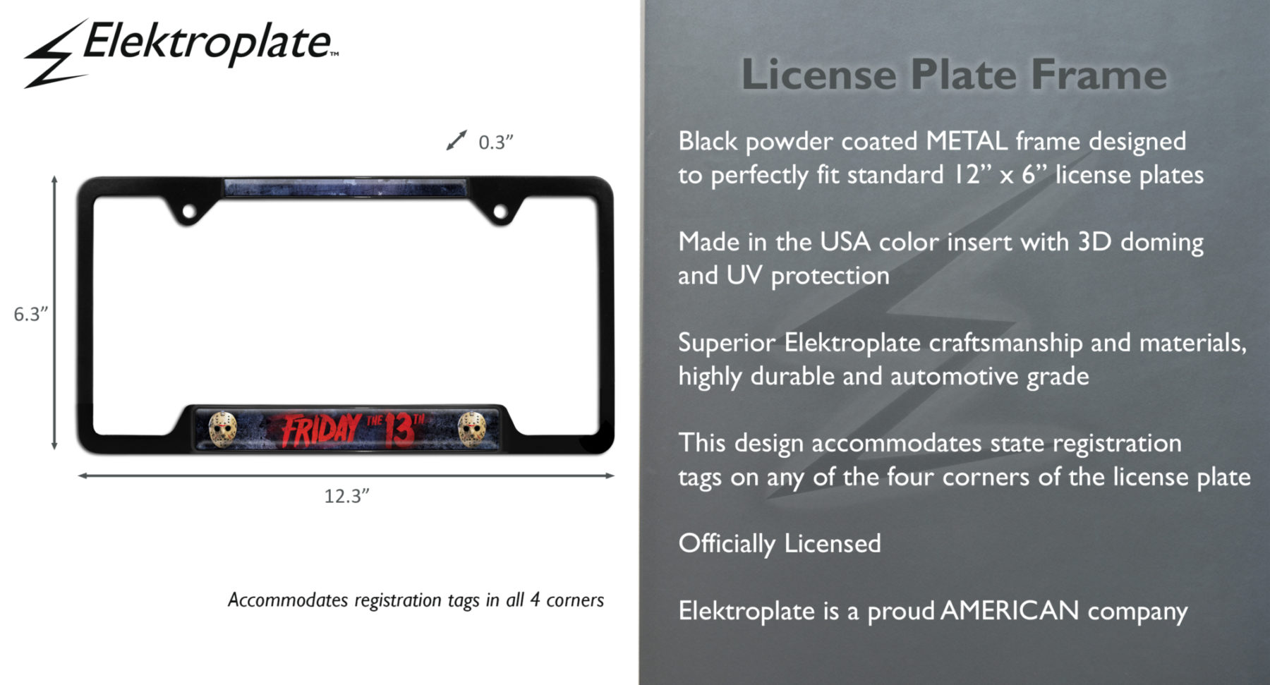 Elevate your vehicle’s style with this Officially Licensed Friday the 13th Jason black powder coated metal license plate frame (12.3" x 6.3") by Elektroplate. This high-quality all-metal frame is built to endure the elements, ensuring it remains looking brand new for years without chipping or fading. The frame features Made in the USA graphic inserts with 3D doming, vivid colors, and UV protection.