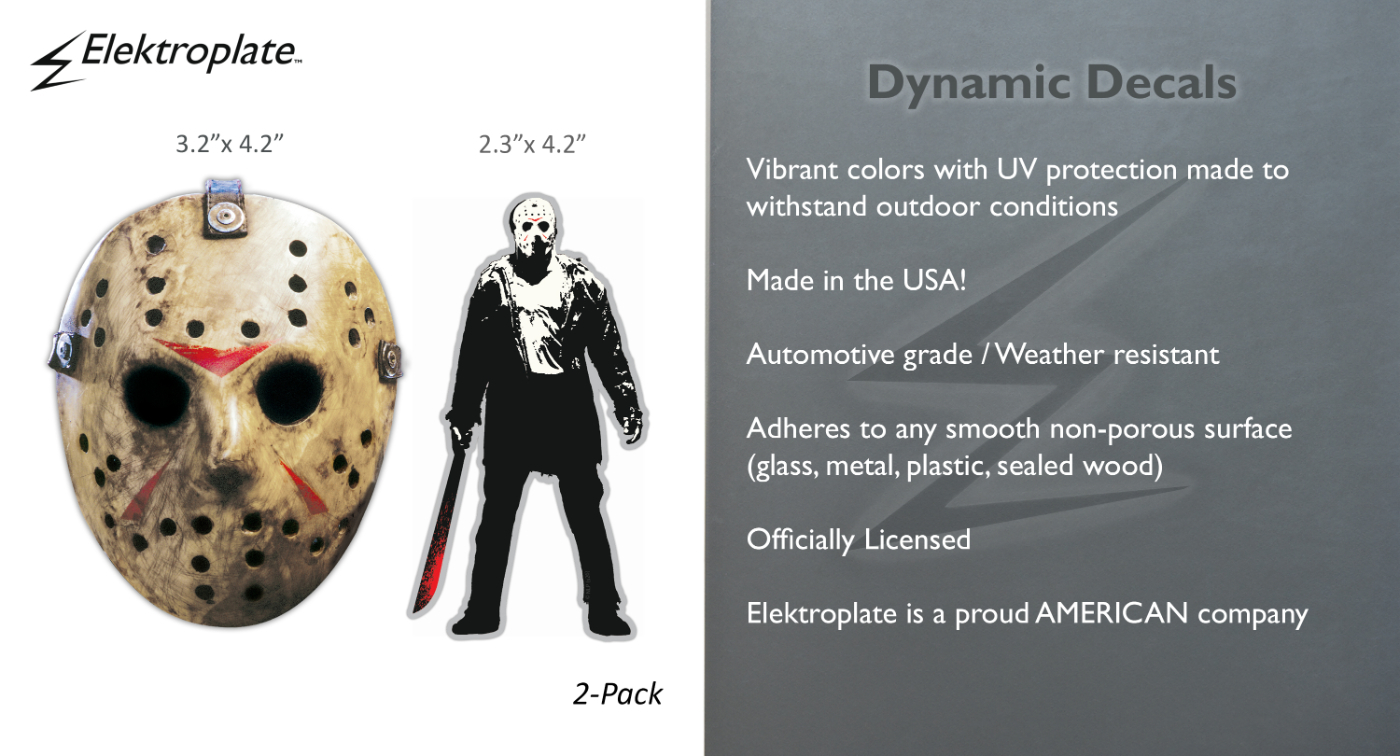 Elektroplate Officially Licensed Jason decal 2-Pack. UV-Protected full-color graphic sticker for application on any smooth, flat surface.