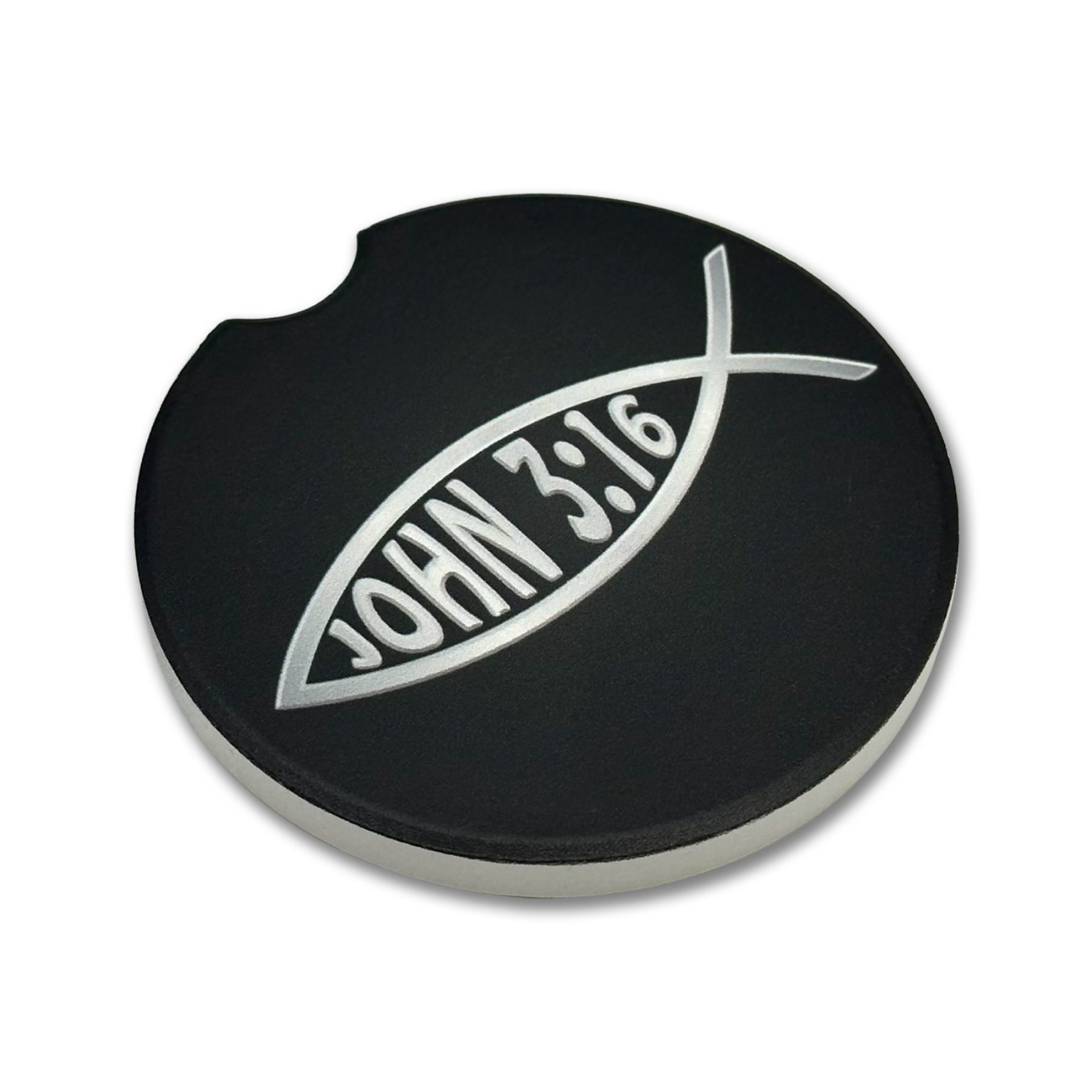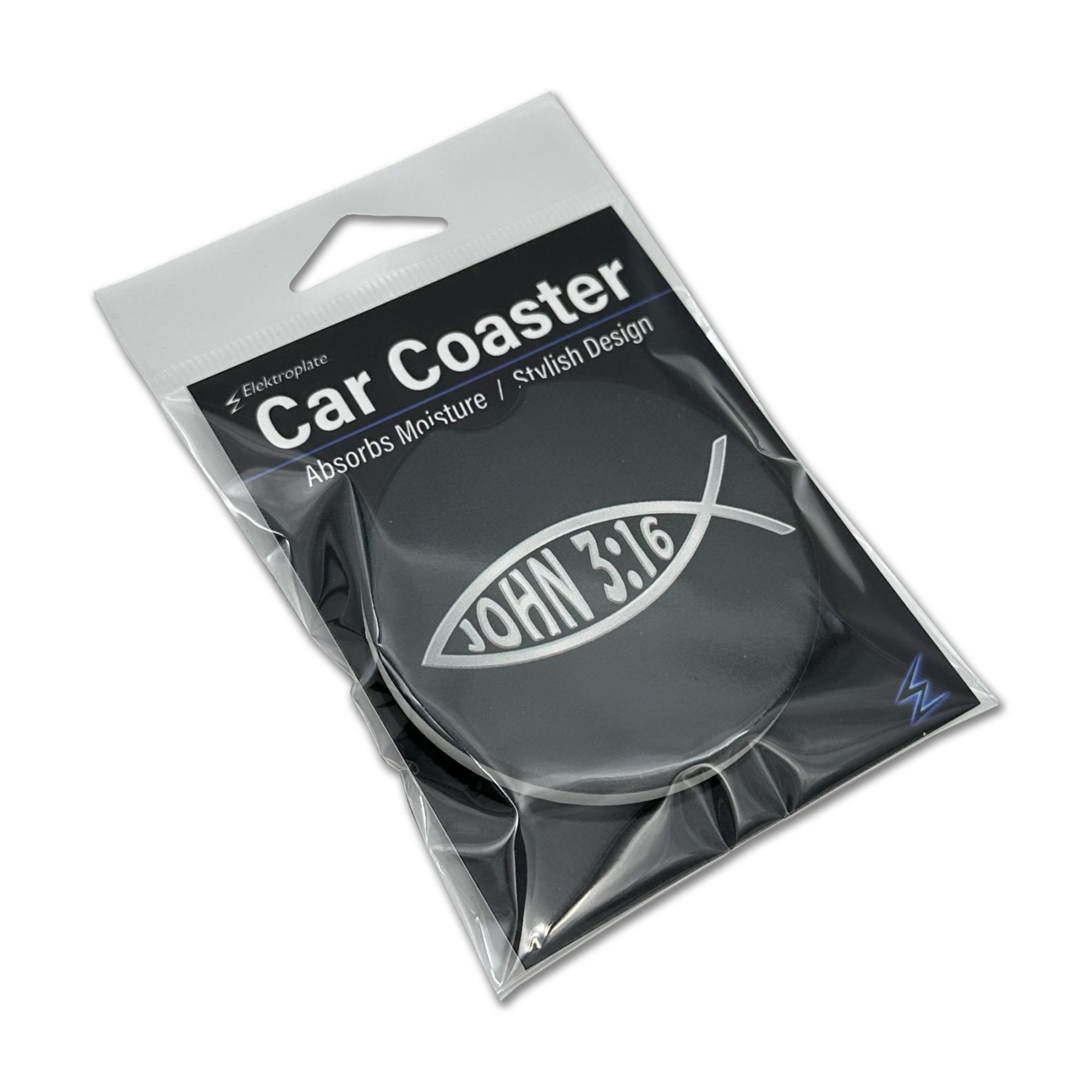 Keep your car cup holders clean and dry with these Elektroplate Christian Fish Car Coasters (Set of 2) featuring the powerful reminder of John 3:16. The timeless Ichthys (Christian fish) symbol is paired with the verse reference to reflect your faith wherever the road takes you. Made with absorbent material to catch condensation and minor spills, these coasters help keep your vehicle clean and organized. With a universal 2.625" diameter, they’re designed to fit most standard cup holders in cars, trucks, and SUVs.