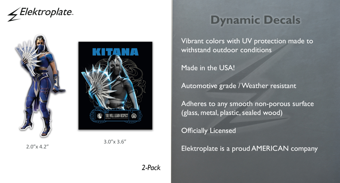 Step into the world of the classic Mortal Kombat gaming series with the Kitana Decal Set of 2! These high-quality, smooth satin vinyl decals capture both Kitana’s fierce pose and abilities in poster-style with bold, detailed artwork. Made in the USA for long-lasting durability.