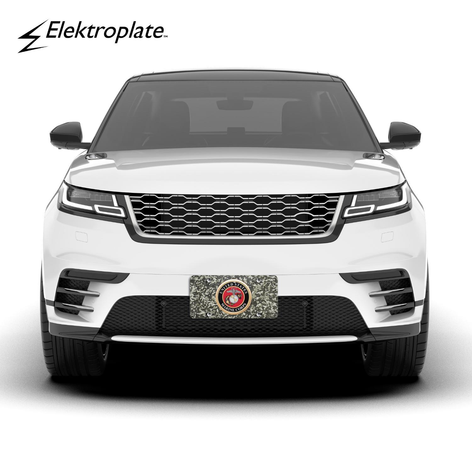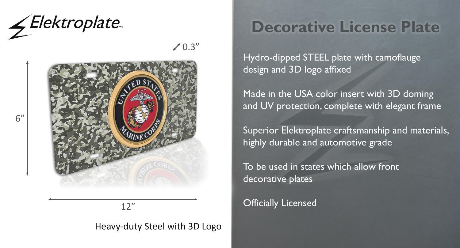 Looking to blend in while standing out? Our unique Elektroplate urban camo pattern is the perfect way to add personality and set your vehicle apart from the rest. Officially licensed – Marine ALL METAL front license plate (12” x 6”) by Elektroplate. Comprised of an all metal emblem adhered to a high-grade camouflage steel license plate base via automotive-grade durable foam tape.
