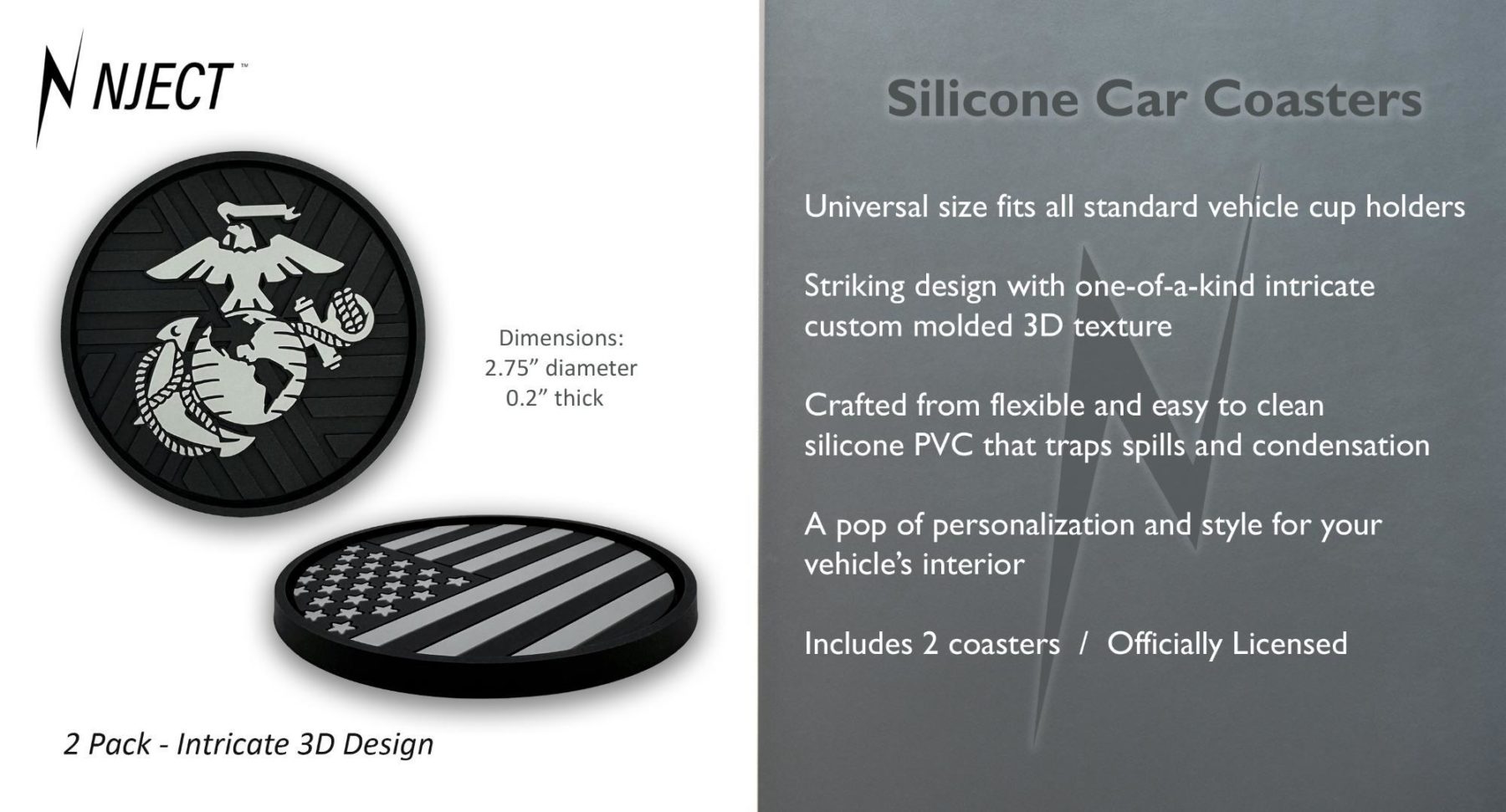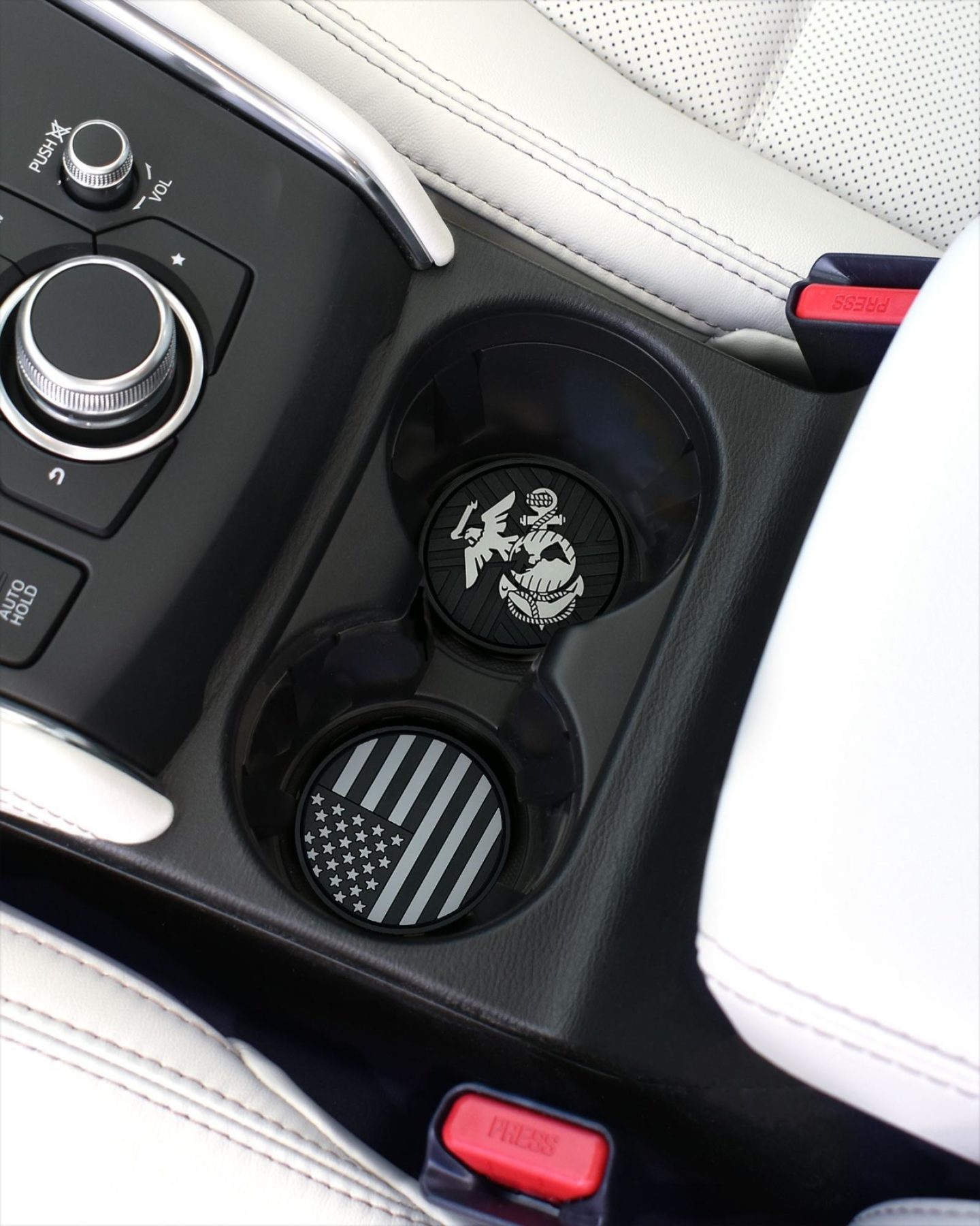 This 2-pack of silicone car coasters features the inverted American flag and Marine Corps insignia design with intricate custom molded 3D texture and bold color contrast. The raised detailing adds depth, durability, and visual impact while providing a pop of personality and style to your vehicle’s interior. Designed for everyday use, these silicone cup holder coasters combine functional protection with patriotic flair in a durable automotive accessory.